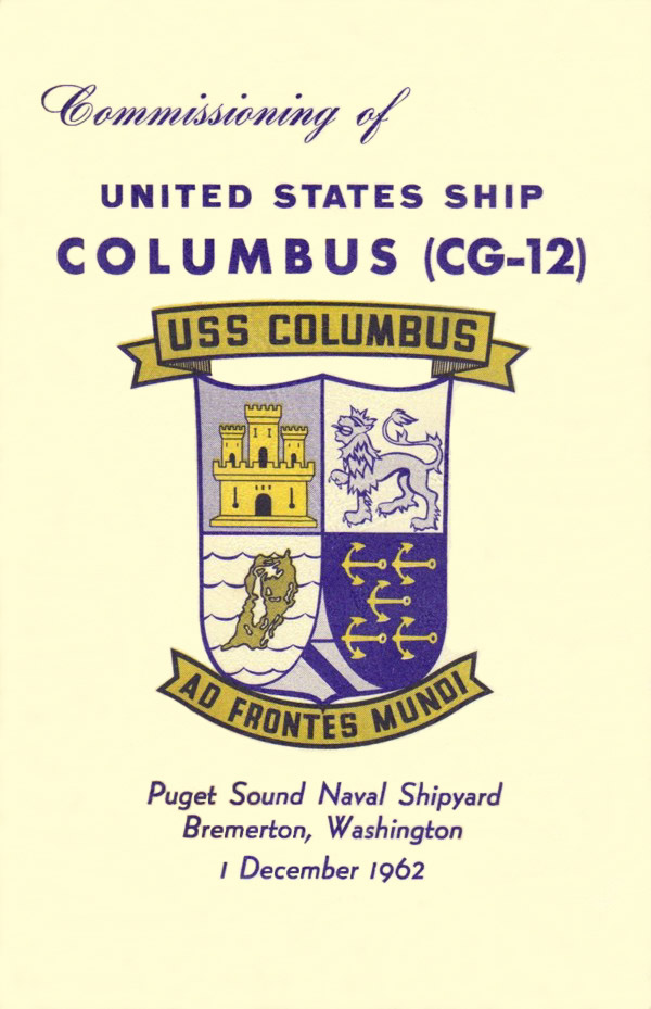 Commissioning Program for the USS Columbus (CG 12) that was held at the Puget Sound Naval Shipyard on 1 December 1962. (image cleaned up by Tom Kermen) Front Cover. |