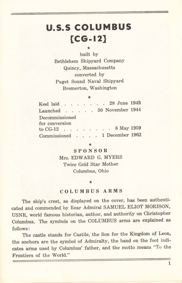 Commissioning Program for the USS Columbus (CG 12) that was held at the Puget Sound Naval Shipyard on 1 December 1962. Page 1. |