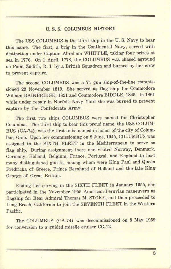 Commissioning Program for the USS Columbus (CG 12) that was held at the Puget Sound Naval Shipyard on 1 December 1962. Page 3. |