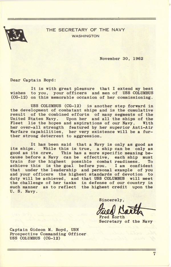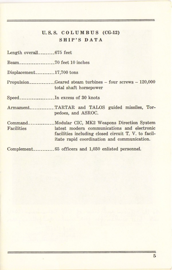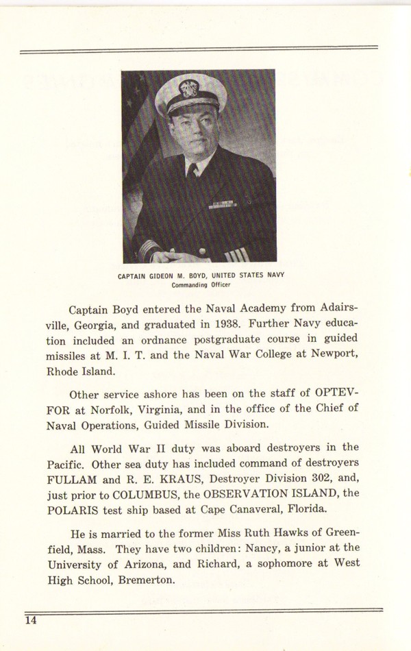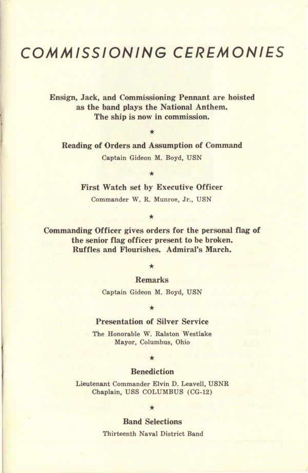 Commissioning Program for the USS Columbus (CG 12) that was held at the Puget Sound Naval Shipyard on 1 December 1962. Page 4. |