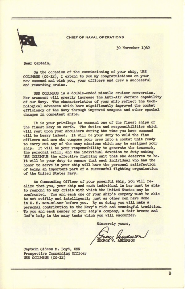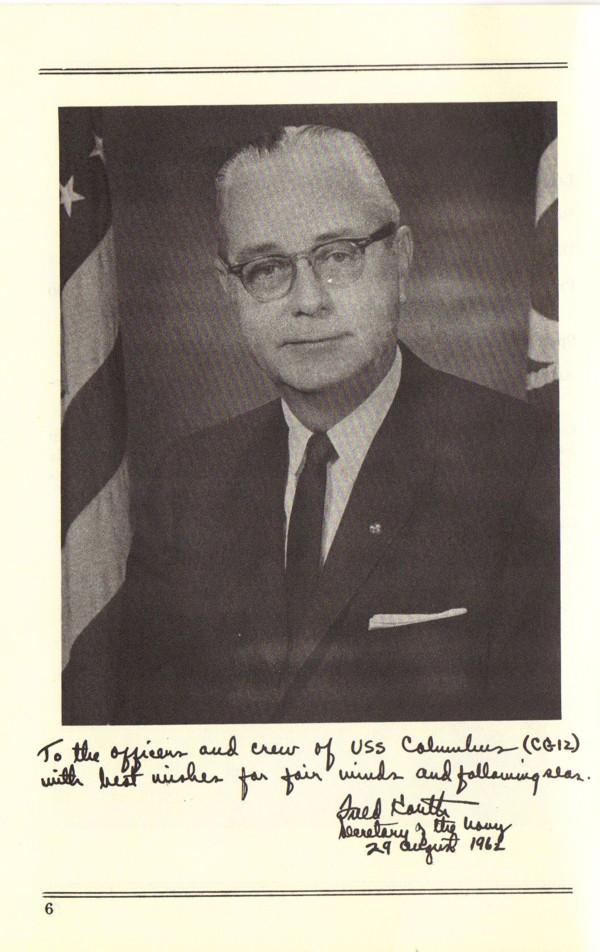 Commissioning Program for the USS Columbus (CG 12) that was held at the Puget Sound Naval Shipyard on 1 December 1962. Page 32. |