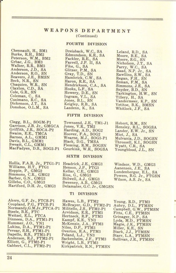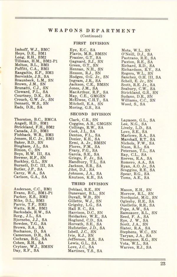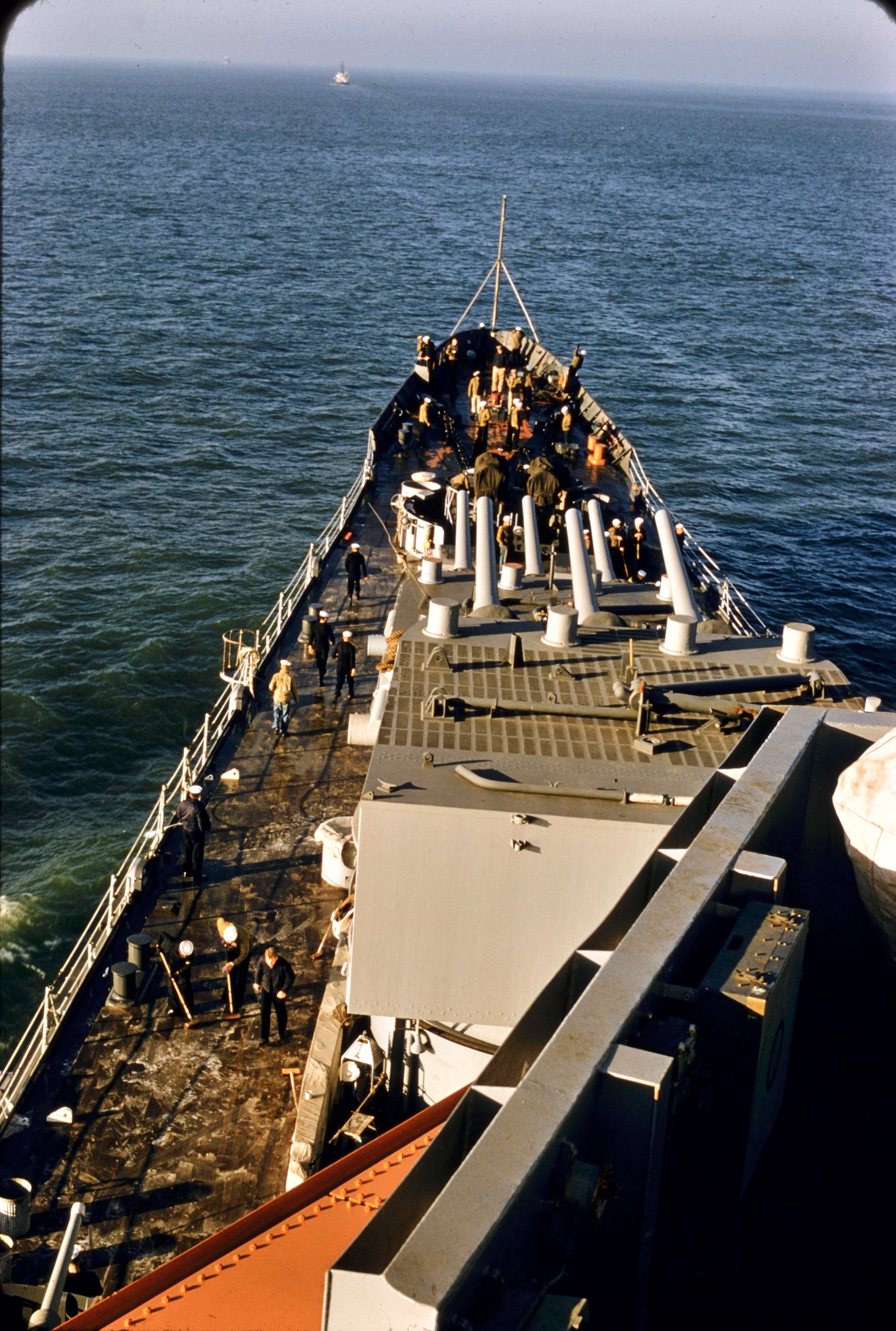 2m | Foredeck of USS Columbus with crew holystoning the deck while in the waters near San Francisco Bay, late 1957 or early 1958. From the collection of Domenic S. Terranova, USS Columbus Fire Control Officer. | Domenic F. Terranova | |