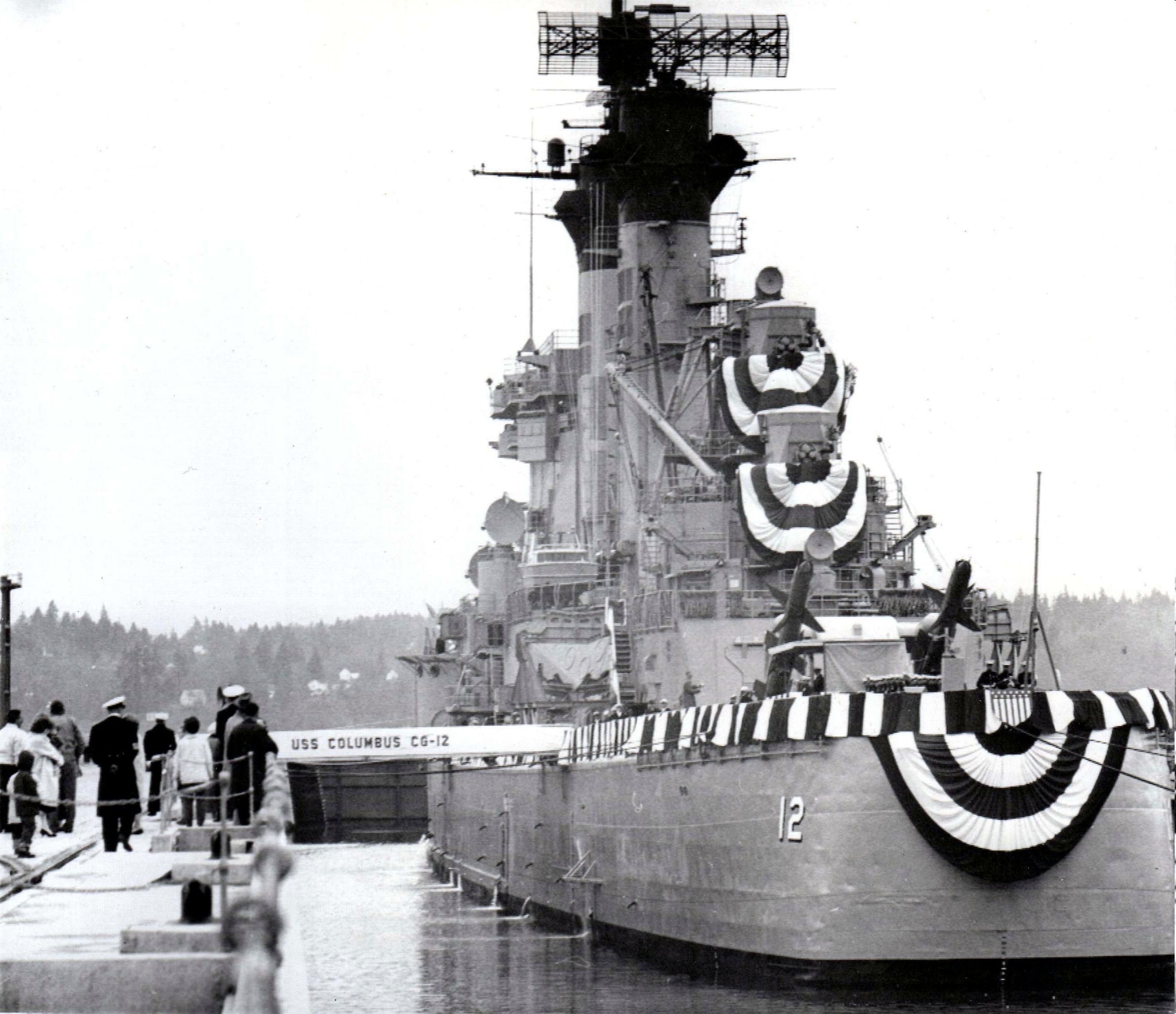 Stern view of the USS Columbus (CG 12) at her re-commissioning at Puget Sound Naval Shipyard on 1 December 1962. Vallejo Naval and Historical Museum |