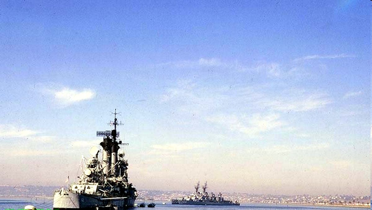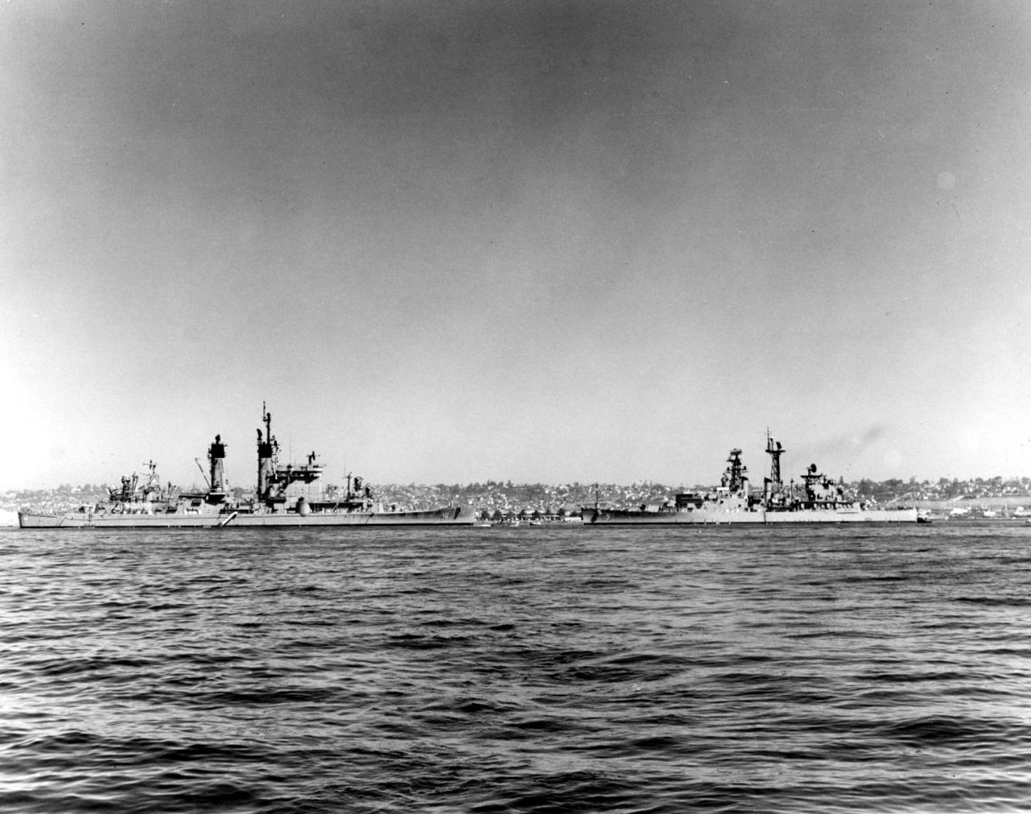USS Columbus (CG 12), at left, and USS Oklahoma City (CLG 5) Moored to Buoys 21, 22 & 23, at San Diego, California, 14 March 1964. Photographed by PH2 R.D. Fennell, USN. Official U.S. Navy Photograph, from the collections of the Naval Historical Center #NH 98673. |