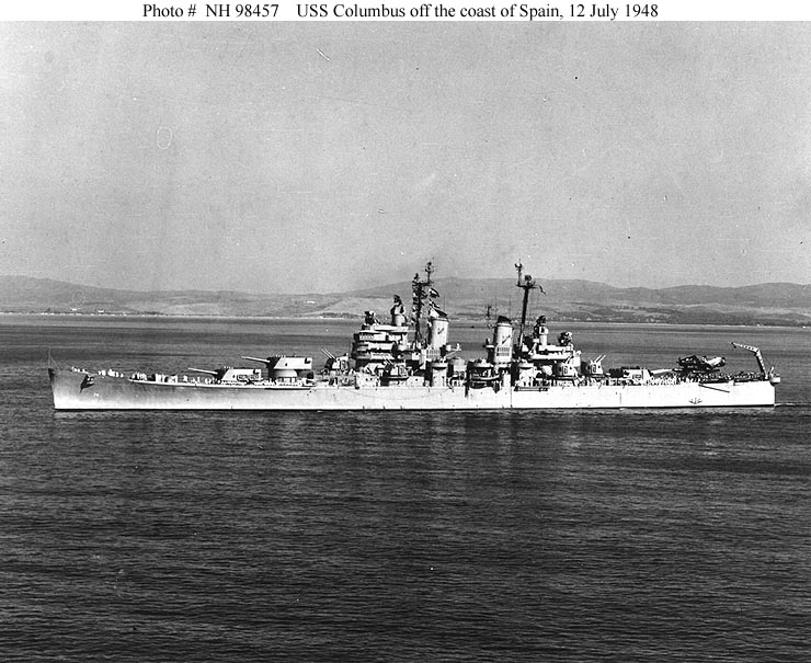 USS Columbus (CA 74) Off the coast of Spain, 12 July 1948. Note that she still has her catapults and Curtiss SC "Seahawk" seaplanes. These were landed and replaced with helicopters within a year. Official U.S. Navy Photograph, from the collections of the Naval Historical Center #NH 98457. |