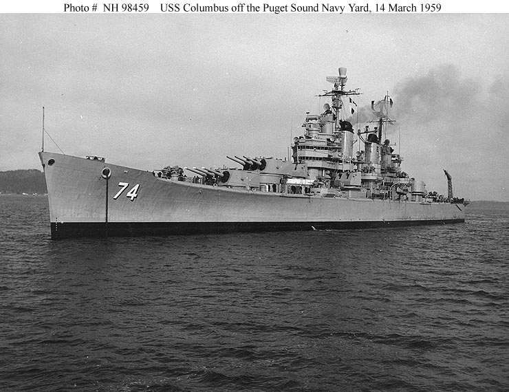 USS Columbus (CA 74) Off the Puget Sound Naval Shipyard, Bremerton, Washington, 14 March 1959. The ship was soon decommissioned to begin conversion to a guided missile cruiser (CG 12). Official U.S. Navy Photograph, from the collections of the Naval Historical Center #NH 98459. |