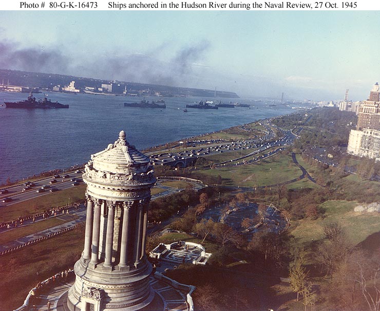 Navy Day Fleet Review, New York Harbor, 27 October 1945 - Ships of the review fleet anchored in the Hudson River, with New York City's Riverside Drive and the Soldiers and Sailors Memorial in the foreground. The George Washington Bridge is in the distance. Ships present are (from left to center): USS Augusta (CA 31); USS Boise (CL 47); USS Columbus (CA 74); and USS Monterey (CVL 26). An escort carrier and several destroyers are anchored beyond Monterey. Official U.S. Navy Photograph, now in the collections of the National Archives #80-G-K-16473. |