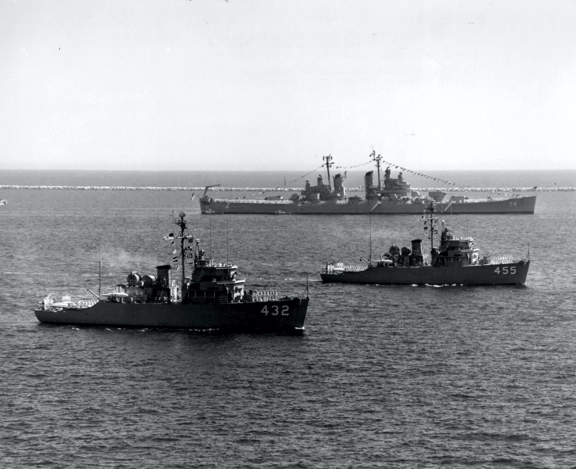 Aerial view of the first Fleet Review in Long Beach, California on 10 September 1956. USS Dynamic (MSO 432), USS Implicit (MSO 455), USS Columbus (CA 74). |