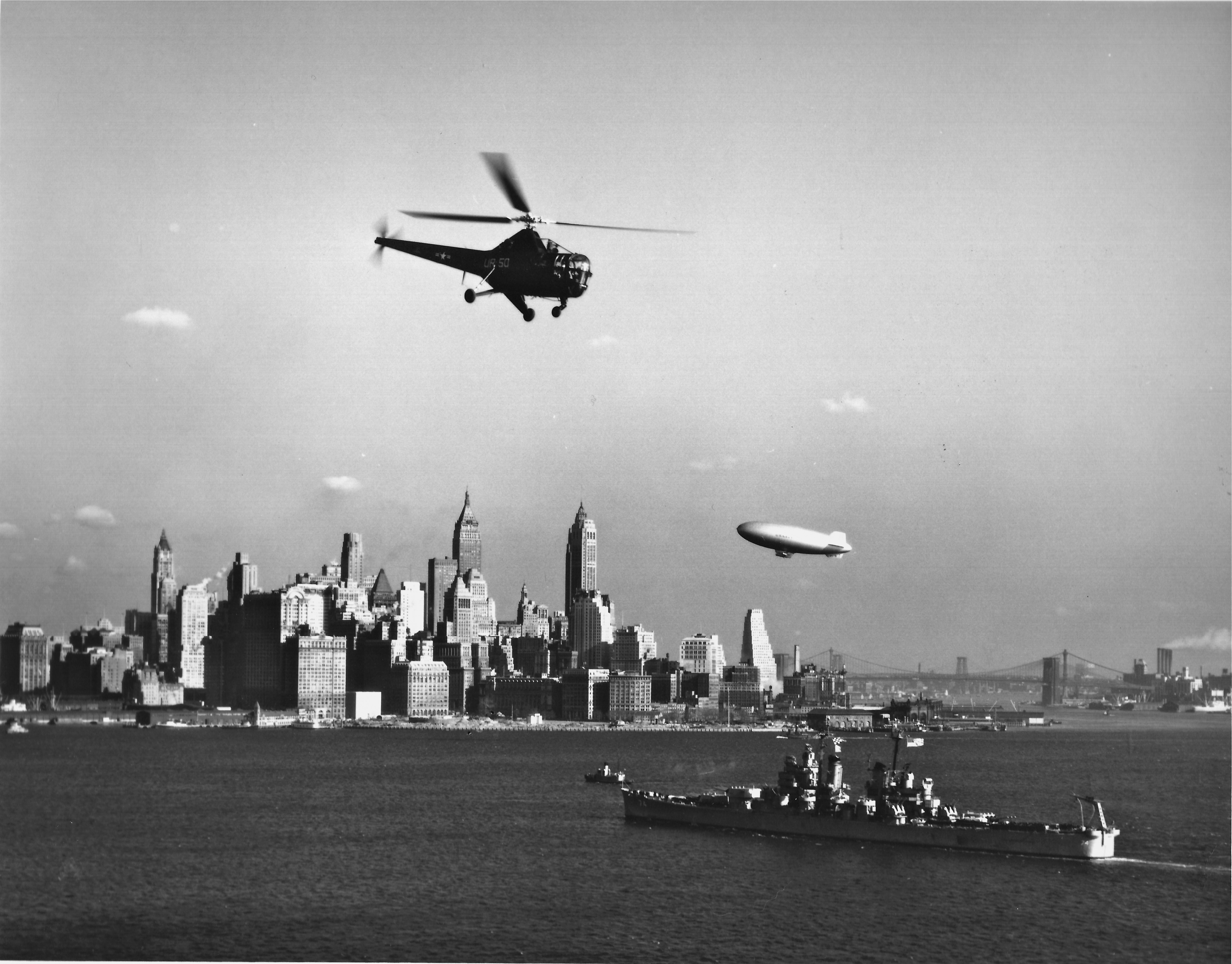 A US Navy HO3S-1 helicopter assigned to HU-2 and a US Navy blimp are brought together with USS Columbus (CA 74) off NYC, 28 March 1951. Note that the crew are at quarters on deck (contrary to the description in the caption, below, which is in error anyway by calling the Heavy Cruiser a "Destroyer"). Both the blimp and helicopter were stationed at NAS Lakehurst, NJ.