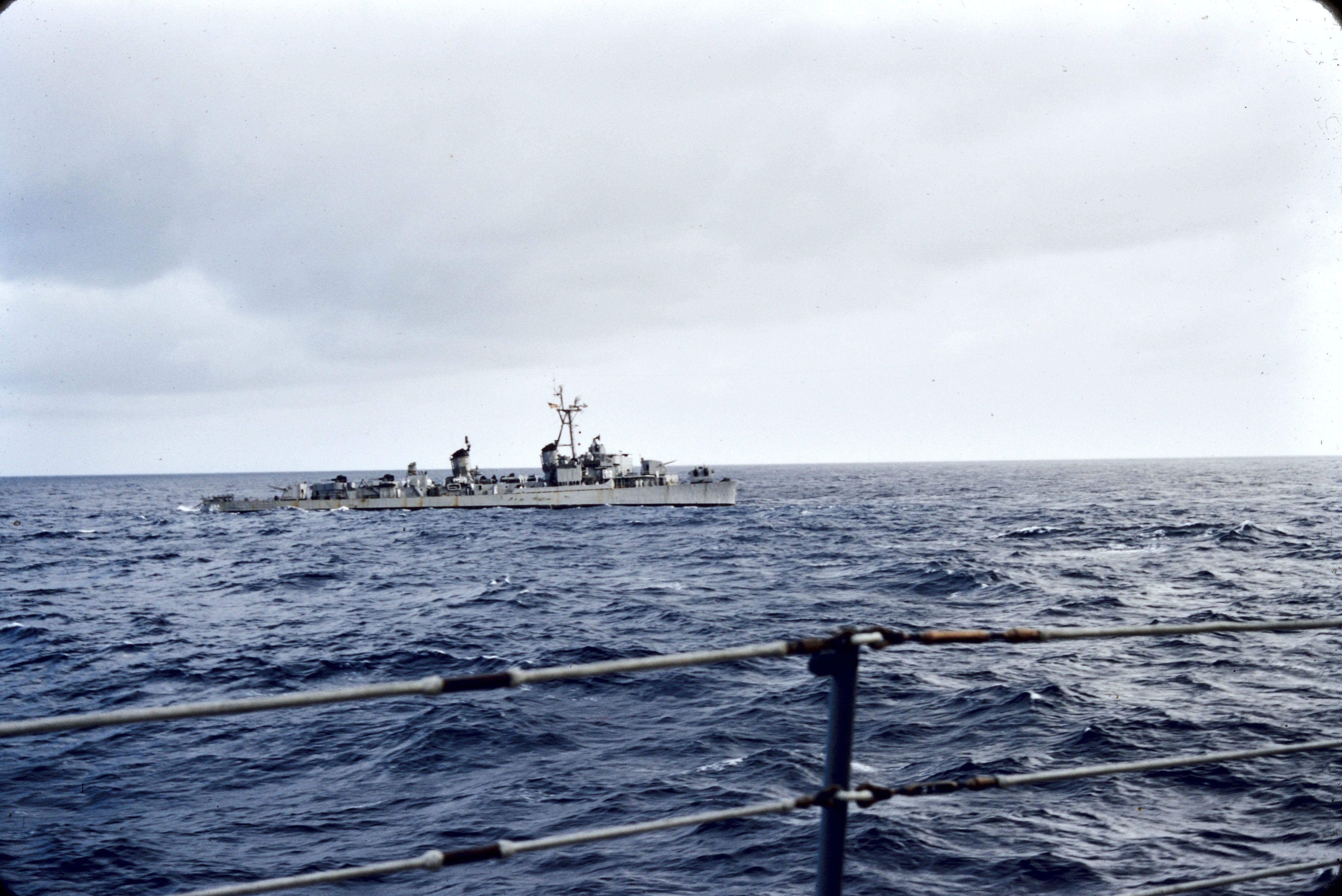 1.7m | USS Floyd B. Parks (DD 884) dead in the water (as noted by the 2 balls on the signal halyard) after the collision between her and Columbus. Note that the Parks is missing about 50 Feet of her bow. Photo taken from Columbus around 11 March 1956. From the collection of Domenic S. Terranova, USS Columbus Fire Control Officer. | Domenic F. Terranova | |