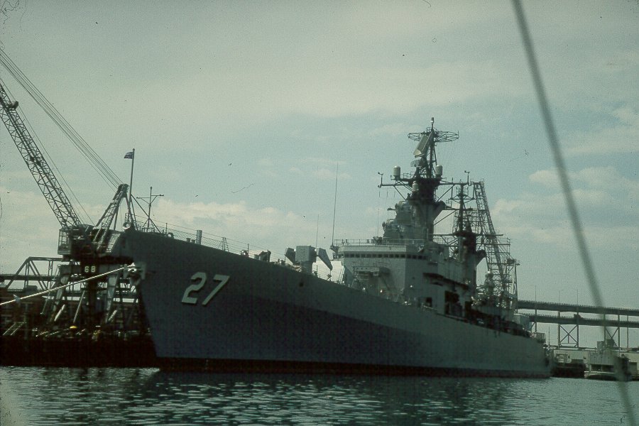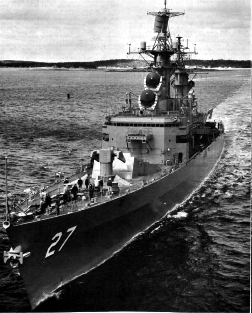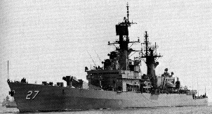 CLASS - BELKNAP Displacement 8,957 Tons, Dimensions, 547' (oa) x 54' 10" x 29' (Max) Armament 1 Terrier/ASROC (60 Missiles) 1 x 5"/54RF, 2 x 3"/50, 6 x12.75" TT. Machinery, 85,000 SHP; Geared Turbines, 2 screws Speed, 34 Knots, Crew 400. Operational and Building Data Keel laid on 23 APR 1962 by Bath Iron Works, Bath, ME Launched 02 DEC 1963 Commissioned 08 MAY 1965 Reclassified CG 27 on 30 JUN 1975 Decommissioned 22 JAN 1994 Stricken 22 JAN 1994 Fate Sold for scrap to International Shipbreaking LTD, Brownsville, TX. Scrapping completed 08 NOV 1999. |