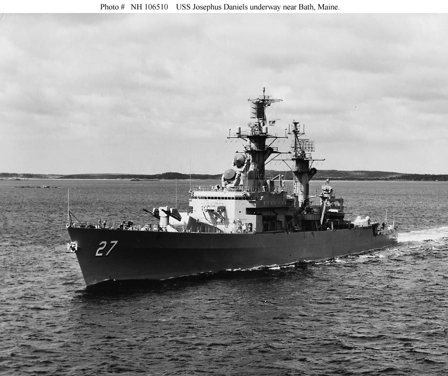 USS Josephus Daniels (DLG 27) underway during sea trials near Bath, Maine, circa March 1965. Photograph received by the Naval Photographic Center on 5 April 1965. Official U.S. Navy Photograph, from the collections of the Naval History and Heritage Command. Photo #NH 106510. |
