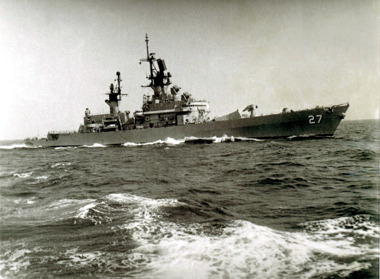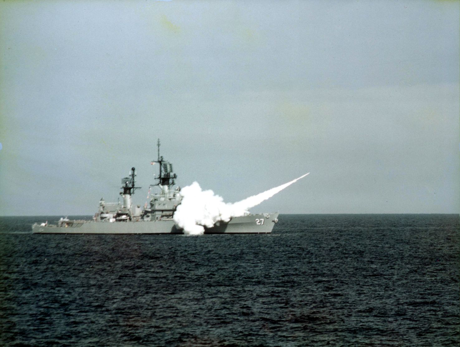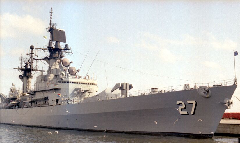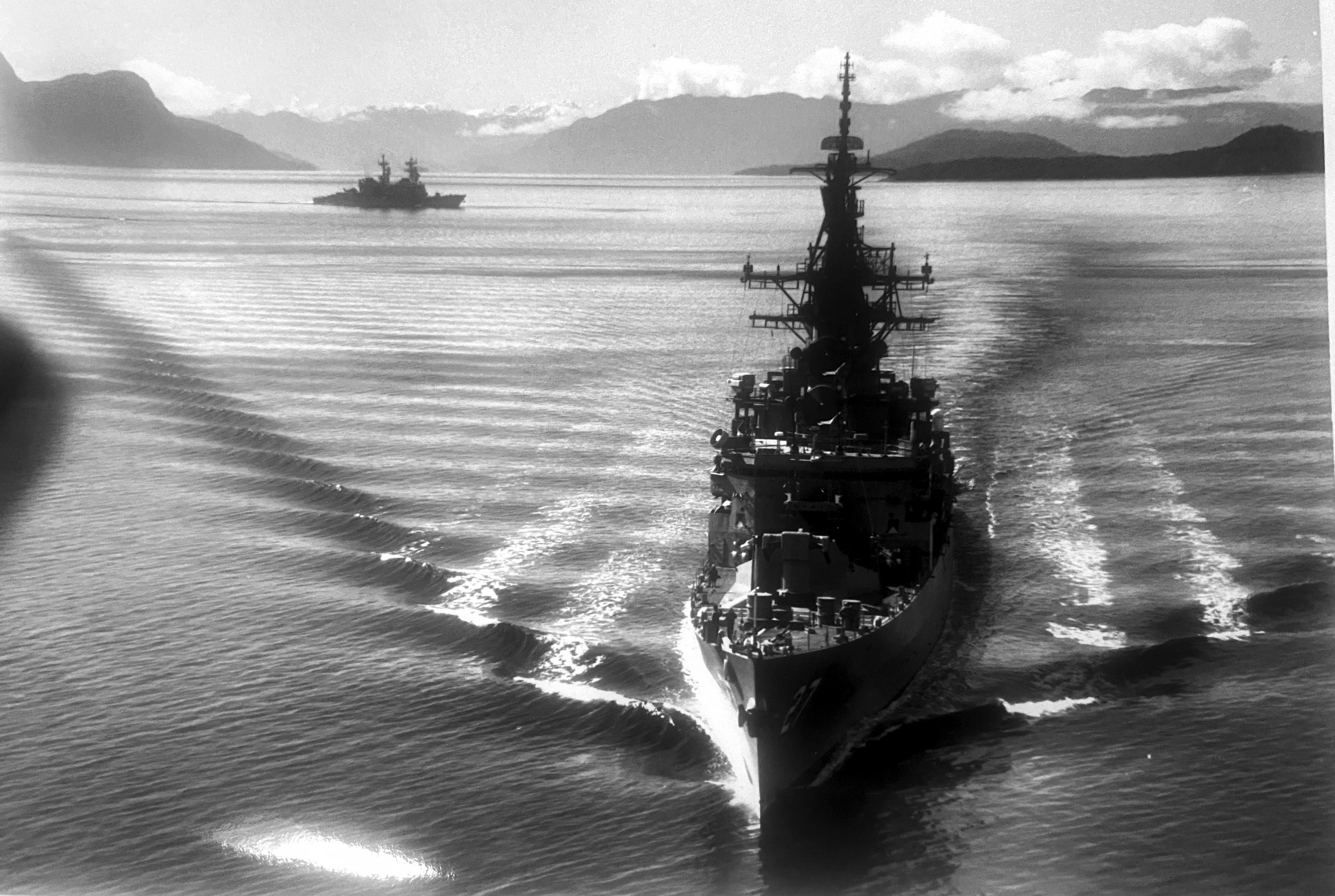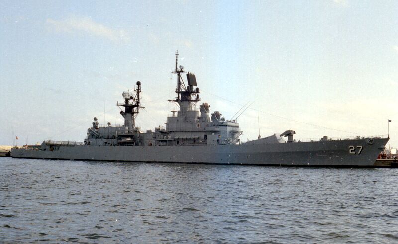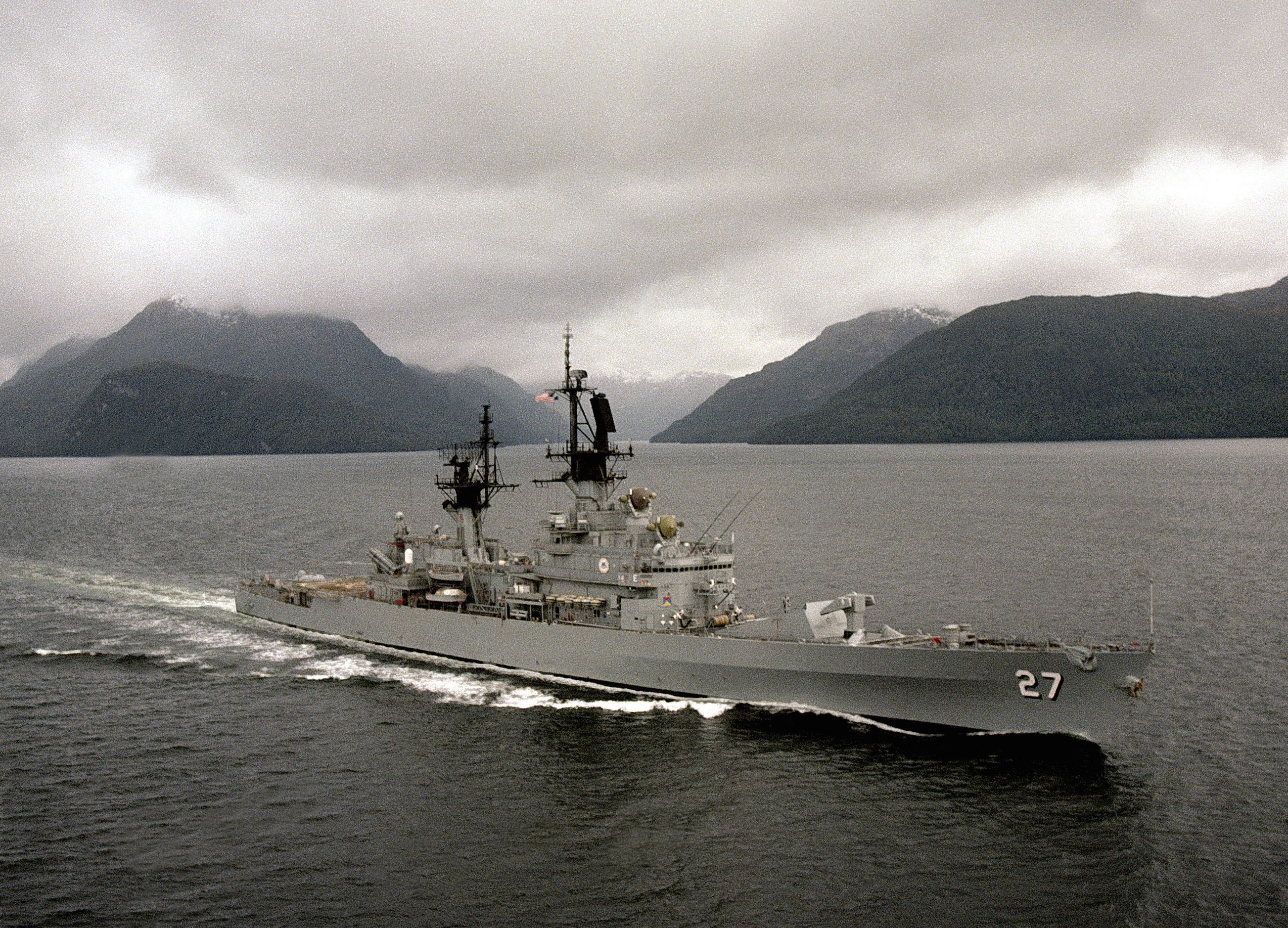 1.3m | Starboard bow view of the guided missile cruiser USS Josephus Daniels (CG 27) underway in the Straits of Magellan on 01 July 1990 during Unitas XXXI, a combined exercise involving the naval forces of the United States and nine South American nations. PH1 Michael D. P. Flynn, U.S. Navy photo #DN-SC-92-03068. |