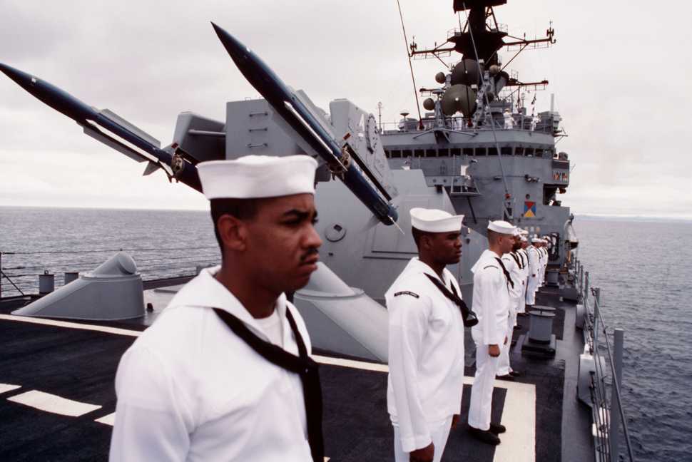 Sailors man the rails aboard the guided missile cruiser USS Josephus Daniels (CG 27) as the ship enters port during Unitas XXXI, an annual, joint exercise between the U.S. Navy and the naval forces of nine South American countries. Photo by PH1 Michael D.P. Flynn, 01 January 1990. U.S. Navy photo #DN-ST-91-06114 |