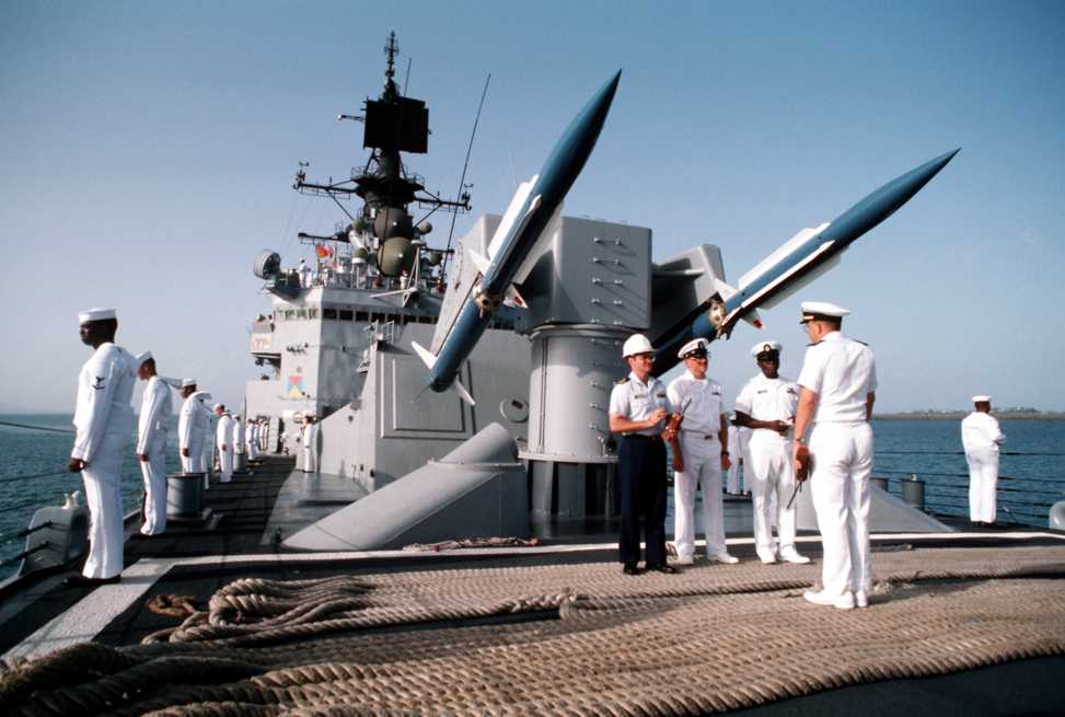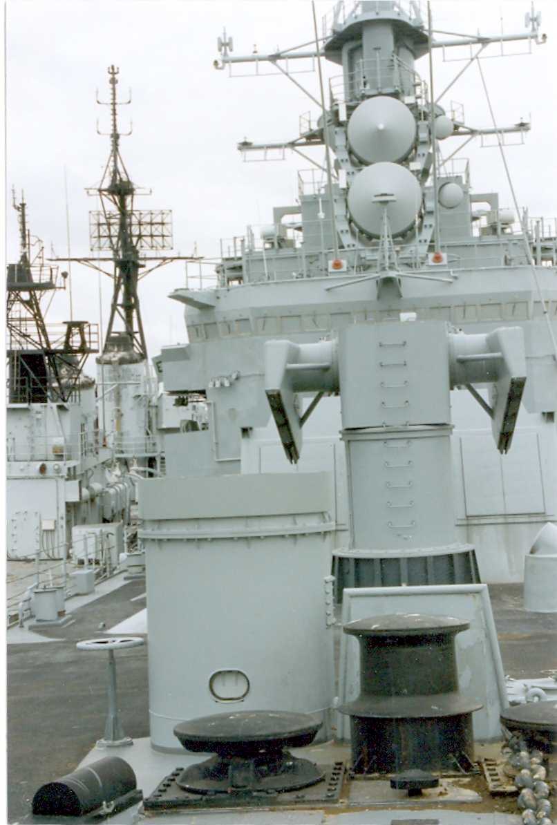 Sailors man the rails as officers stand beneath the TSAM's (Training Surface-to-Air Missile) on the Mark 10 launcher aboard the guided missile cruiser USS Josephus Daniels (CG 27). Photo by PH1 Michael Flynn, January 1 1990. U.S. Navy photo #DN-ST-91-06120 |