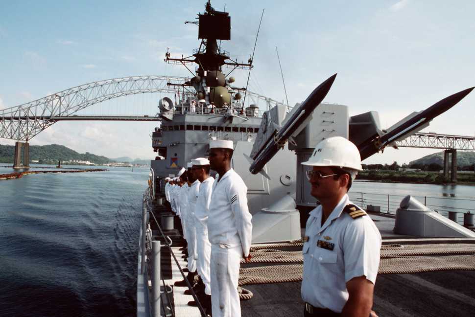 LT Robert Watts mans the rails with his division aboard the guided missile cruiser USS Josephus Daniels (CG 27) after the ship passes under the Bridge of the Americas. The cruiser is one of five U.S. Navy ships taking part in Unitas XXXI, an annual, joint, a combined exercise involving the naval forces of the United States and nine South American nations. Photo by PH1 Michael Flynn, 01 July 1990. U.S. Navy photo #DN-ST-91-06113 |