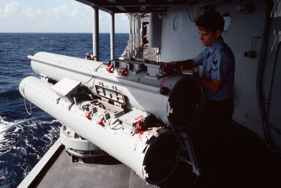 Torpedoman's Mate 1st Class Hans D. Defor performs maintenance on the Mark 32 torpedo tubes aboard the guided missile cruiser USS Josephus Daniels (CG 27) as the ship is underway during Unitas XXXI, an annual, joint exercise between the U.S. Navy and nine South American nations. Photo by PH1 Michael Flynn, 01 January 1990. U.S. Navy photo #DN-ST-91-06104 |