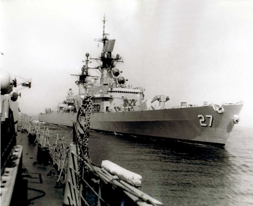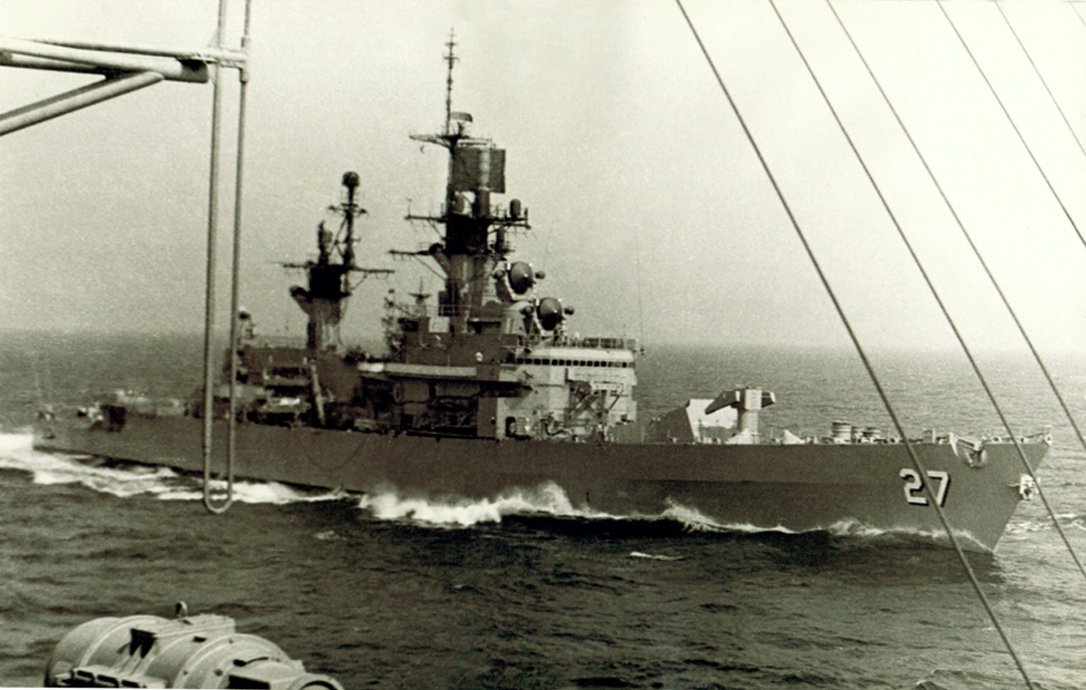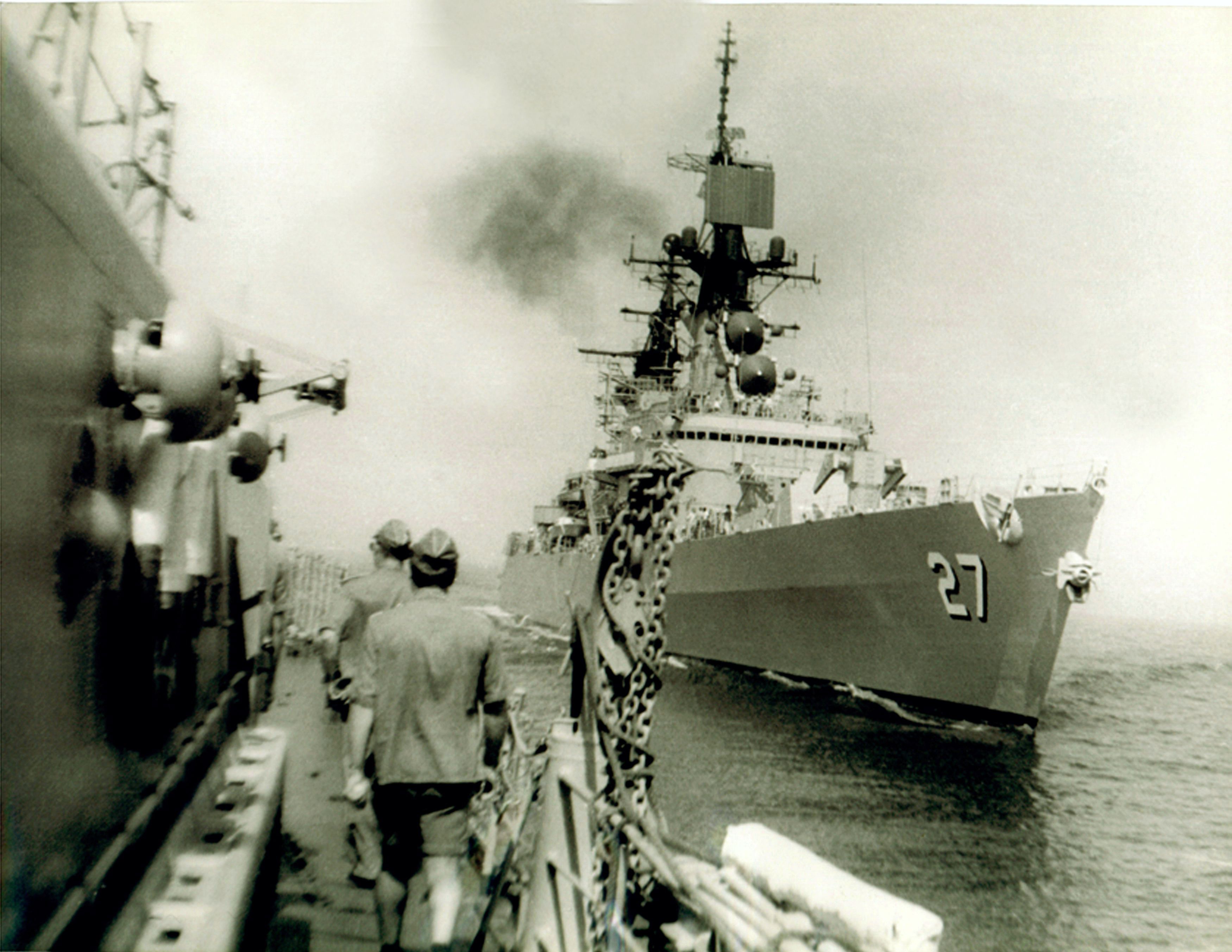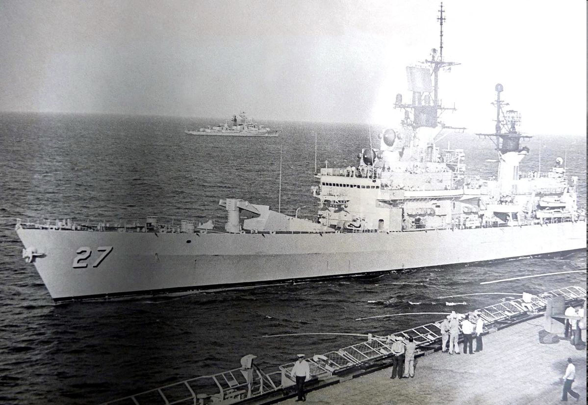 170k | View from the Soviet carrier Kiev: CG 27 makes it alongside the Kiev. The Krasny Krim is in the background. | Eugene Ivkin | |