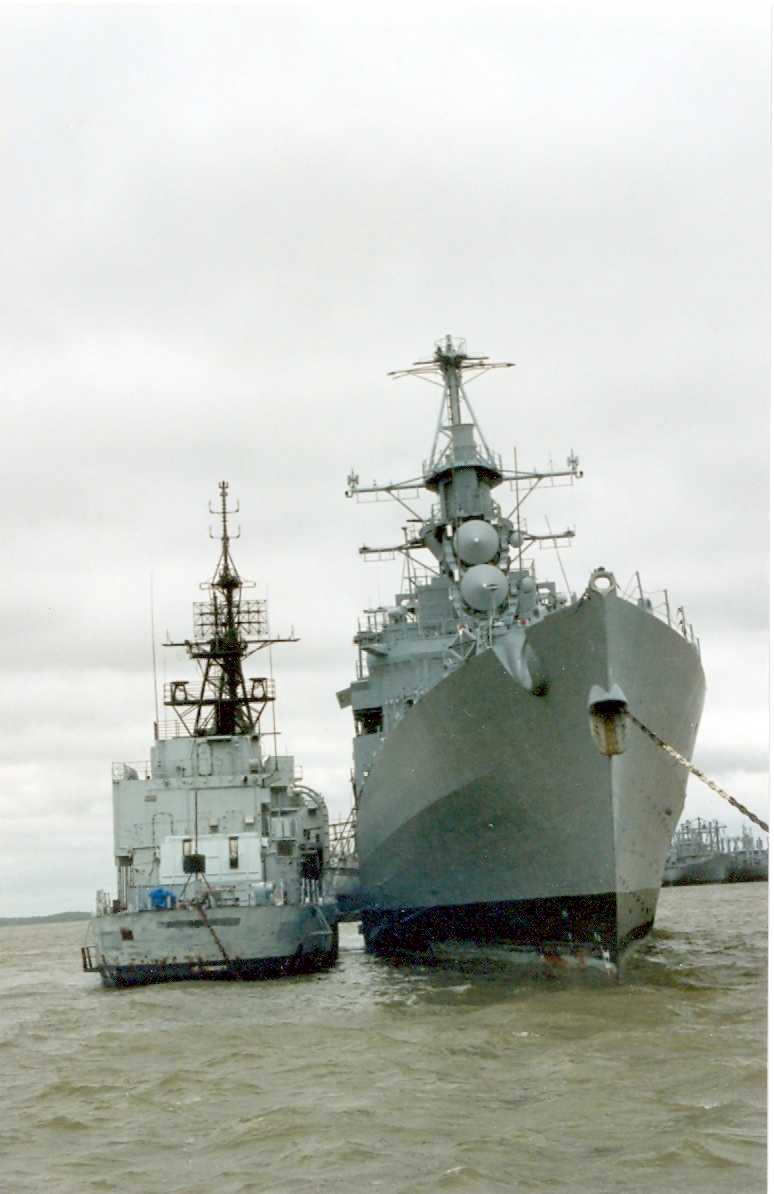The destroyer USS Hayler (DD 997) and the guided missile cruiser USS Josephus Daniels (CG 27) lie at anchor while visiting a port during Unitas XXXI, an annual, joint exercise between the U.S. Navy and the naval forces of nine South American countries. Photo by PH1 Michael Flynn, January 1 1990. U.S. Navy photo #DN-ST-91-06195 |