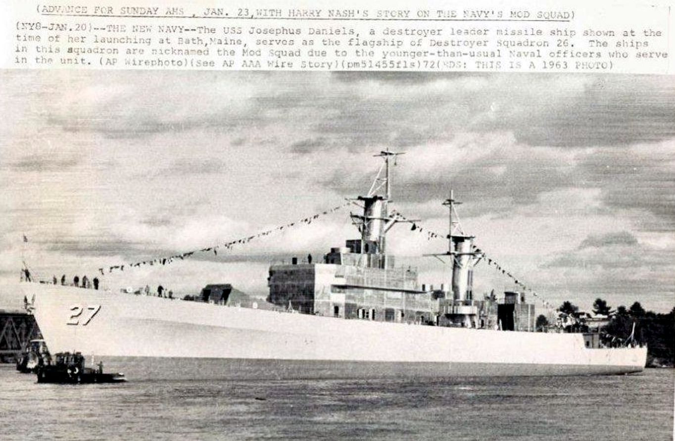 187k | Photo caption: "(NY8-JAN.20)--THE NEW NAVY--The USS Josephus Daniels, a destroyer leader missile ship shown at the time of her launching at Bath, Maine, serves as the flagship of Destroyer squadron 26. The ships in this squadron are nicknamed the Mod Squad due to the younger-than-usual Naval officers who serve in the unit. (AP Wirephoto) (See AP AAA Wire Story) pm51455fls) 72 (EDS: THIS IS A 1963 PHOTO)" | Tommy Trampp | |