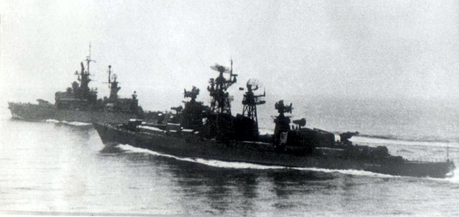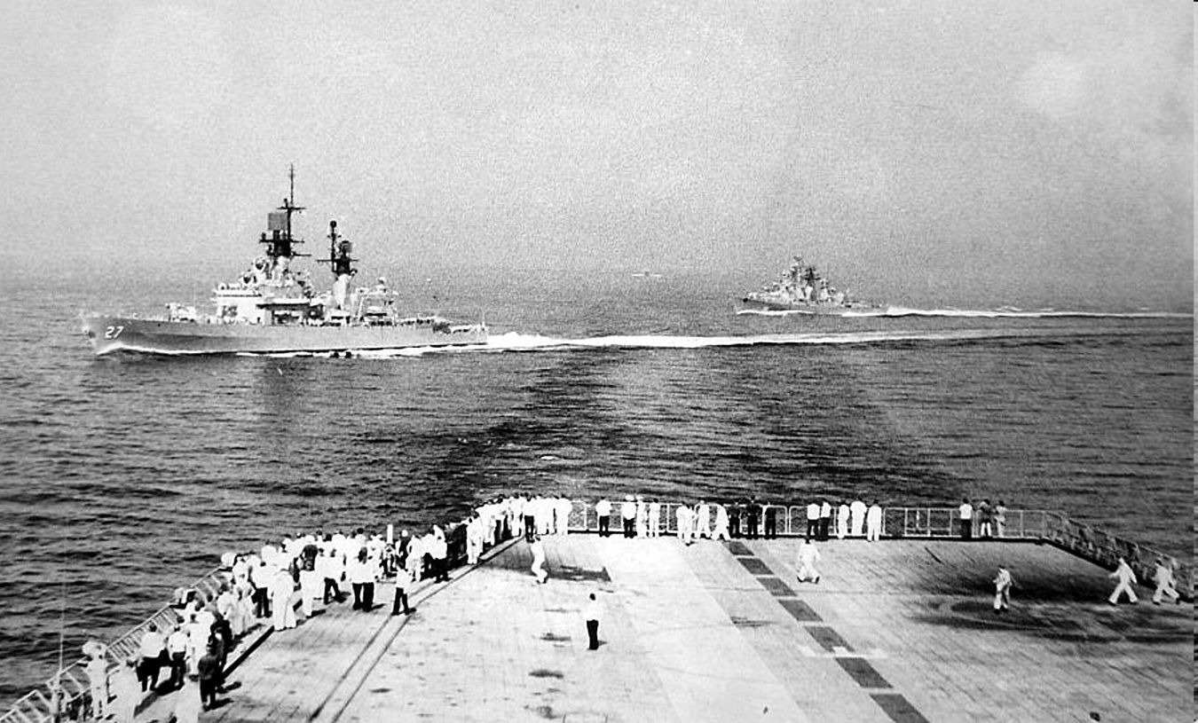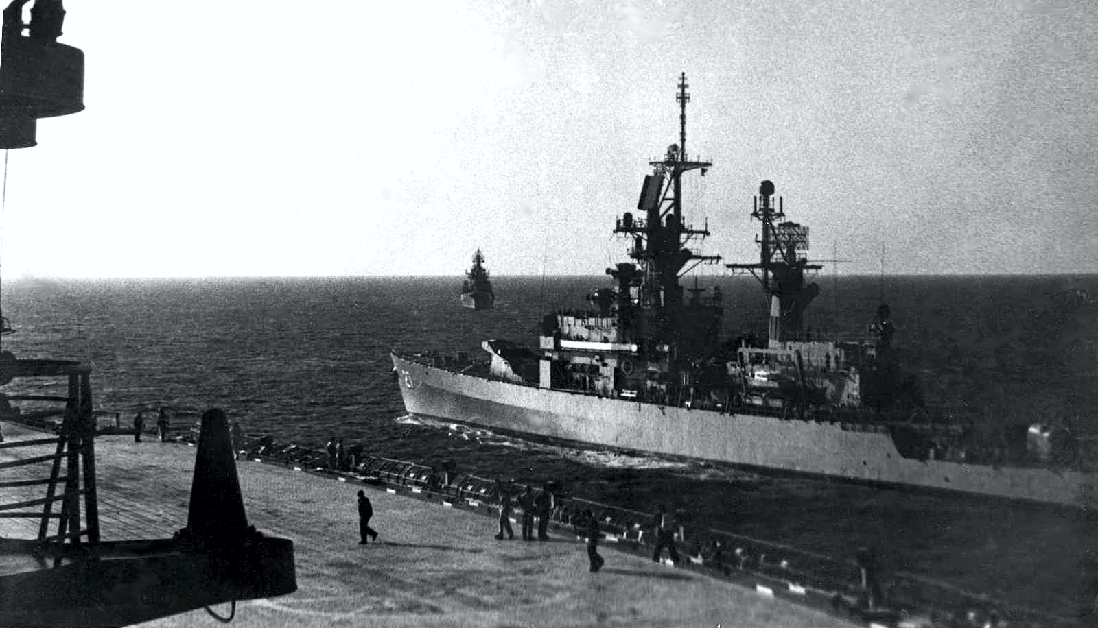 136k | View from the Soviet carrier Kiev: CG 27 penetrates into formation and the Soviet DDG Krasny Krim catching up to her. | Eugene Ivkin | |