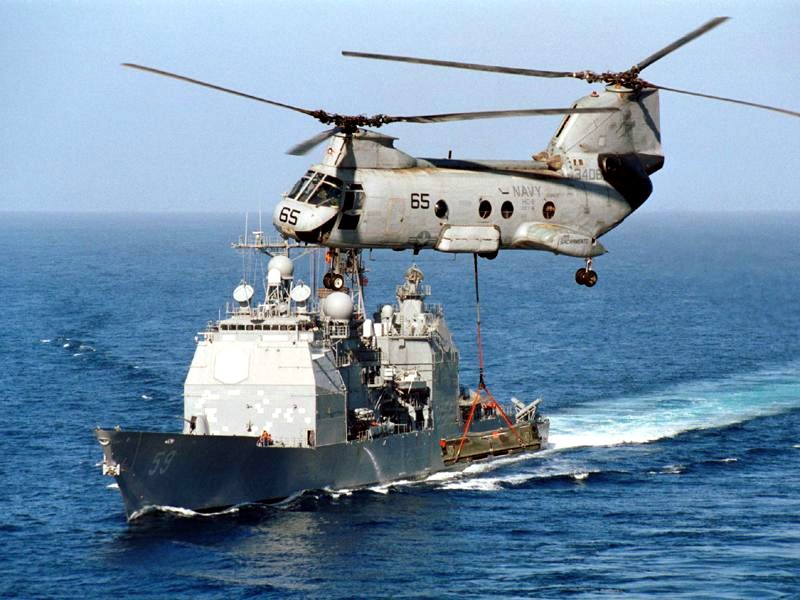 The guided missile cruiser USS Princeton (CG 59) is at station just aft of the aircraft carrier USS Carl Vinson (CVN 70) as a CH-46D Sea Knight of the "Gunbearers" of Helicopter Support Squadron One One (HC-11) delivers ordnance to the carrier on 19 OCT 2001. Carl Vinson and its carrier airwing are part of Operation Enduring Freedom. U.S. Navy photo #011019-N-7265L-003 by Photographer's Mate Airman Inez Lawson. |