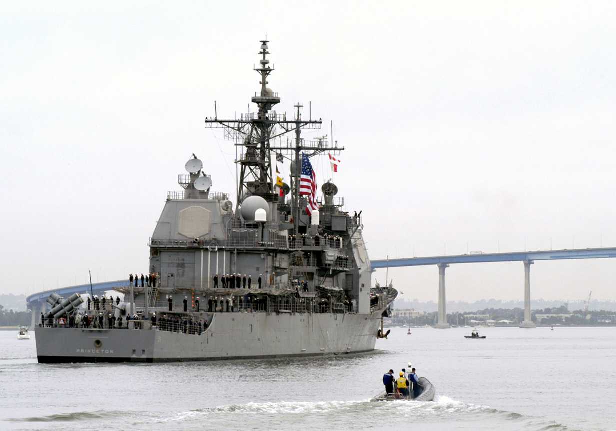 3 March 2003 - USS Princeton (CG 59) pulls away from its homeport of Naval Station San Diego. Princeton is part of USS Nimitz (CVN 68) Strike Group deployed in the Arabian Gulf conducting missions in support of Operation Iraqi Freedom, the multi-national coalition effort to liberate the Iraqi people, eliminate Iraqs weapons of mass destruction and end the regime of Saddam Hussein. U.S.Navy photo by Photographers Mate 3rd Class Emmanuel Rios. |