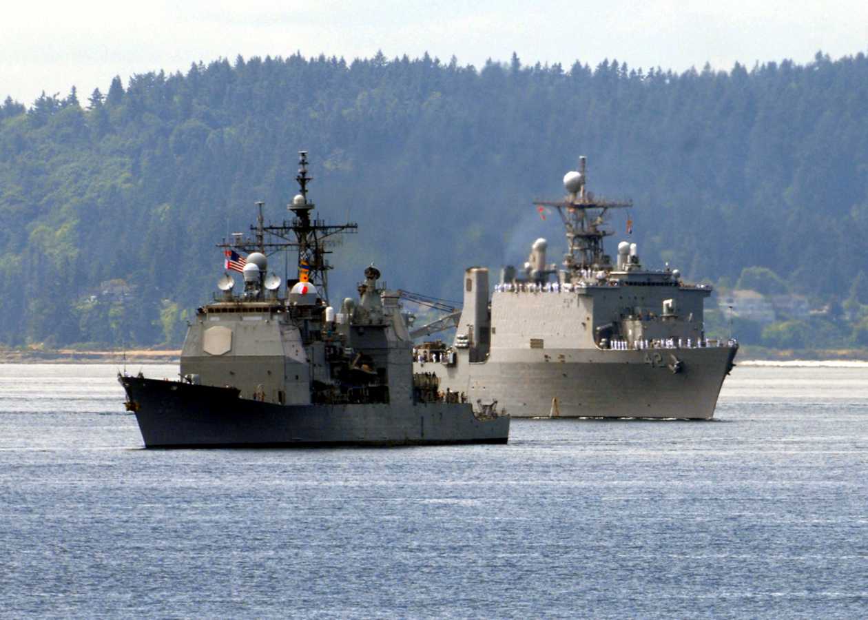 Seattle, WA, 30 July 2008 - The Ticonderoga-class cruiser USS Princeton (CG 59) and Whidbey Island-class amphibious dock landing ship USS Germantown (LSD 42) lead the parade of ships to kick off the 2008 59th annual Seattle Seafair Fleet Week. During the weeklong stay in Seattle, Sailors will get a chance to explore the local community. Navy Weeks are designed to raise awareness in metropolitan areas that do not have a significant Navy presence. U.S. Navy photo #080730-N-7656R-001 by Mass Communication Specialist 2nd Class Eric J. Rowley. |
