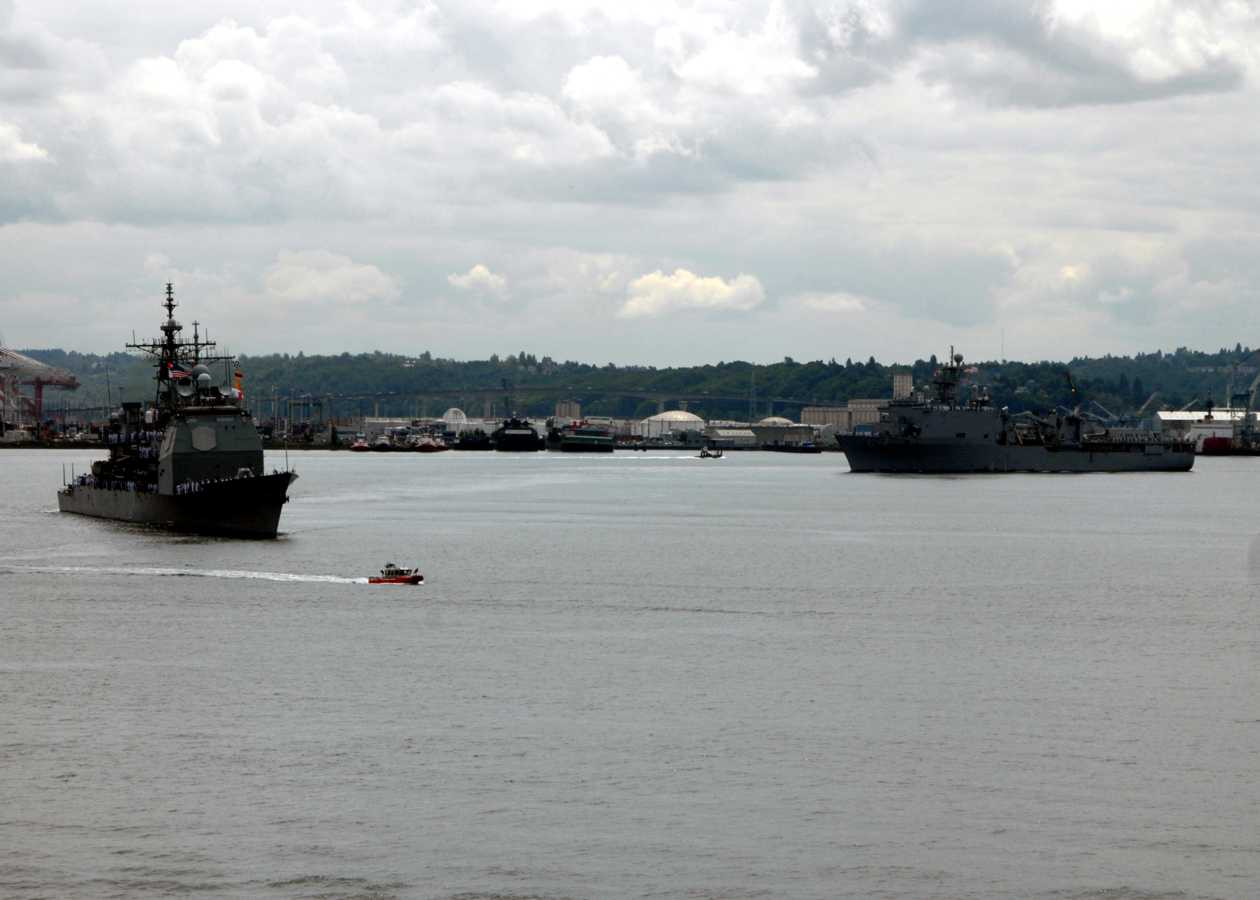 Seattle, WA, 30 July 2008 - The Ticonderoga-class cruiser USS Princeton (CG 59) and The Whidbey Island-class amphibious dock landing ship USS Germantown (LSD 42) lead the parade of ships to kick off the 2008 59th annual Seattle Seafair Fleet Week. During the weeklong stay in Seattle, Sailors will get a chance to explore the local community. Navy Weeks are designed to raise awareness in metropolitan areas that do not have a significant Navy presence. U.S. Navy photo #080730-N-7656R-003 by Mass Communication Specialist 2nd Class Eric J. Rowley. |
