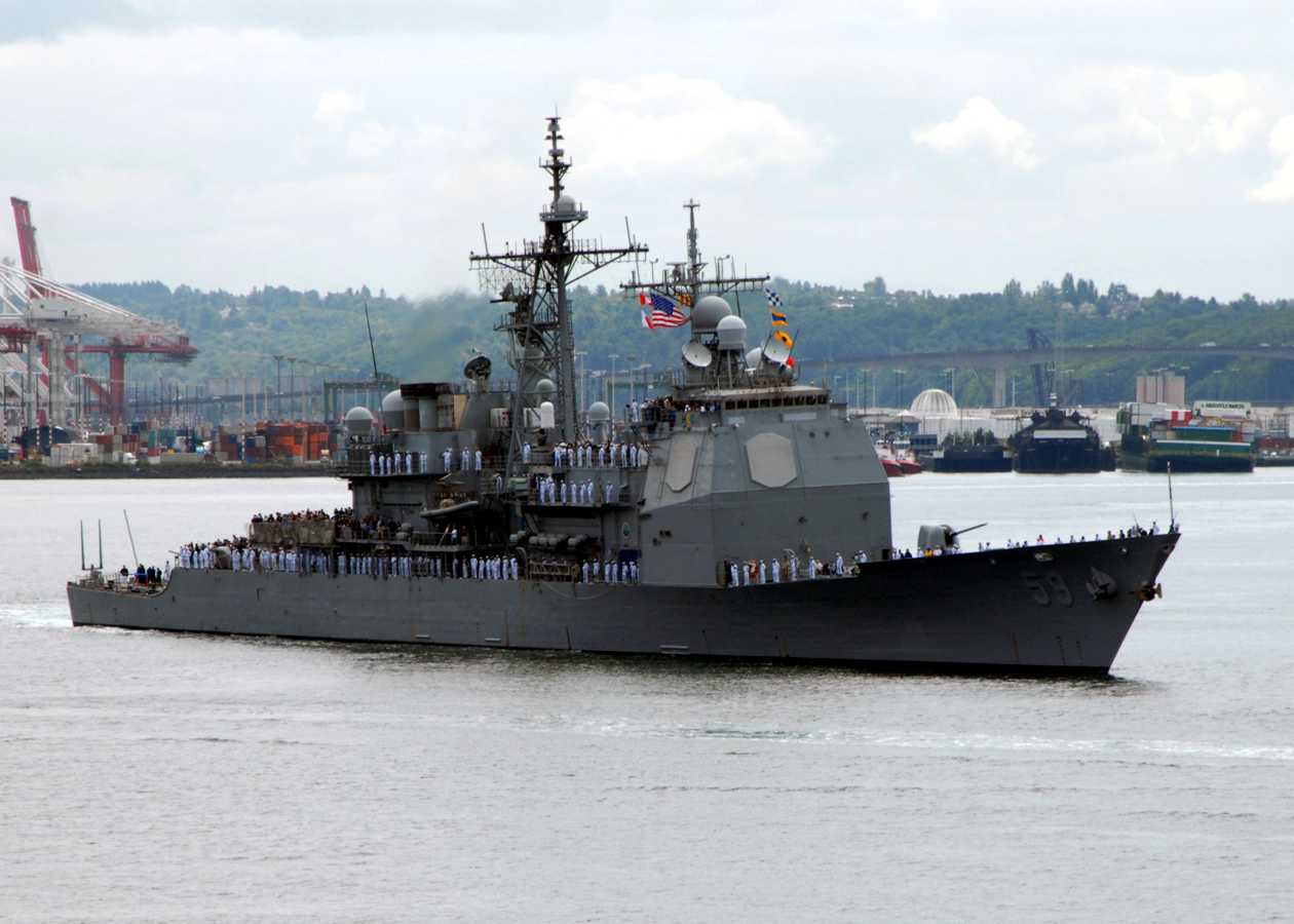 Seattle, WA, 30 July 2008 - The Ticonderoga-class guided-missile cruiser USS Princeton (CG 59) leads the parade of ships, with her sailors manning the rails, to kick off the 2008 59th annual Seattle Seafair Fleet Week. During the weeklong stay in Seattle, Sailors will get a chance to explore the local community. Navy Weeks are designed to raise awareness in metropolitan areas that do not have a significant Navy presence. U.S. Navy photo #080730-N-7656R-004 by Mass Communication Specialist 2nd Class Eric J. Rowley. |