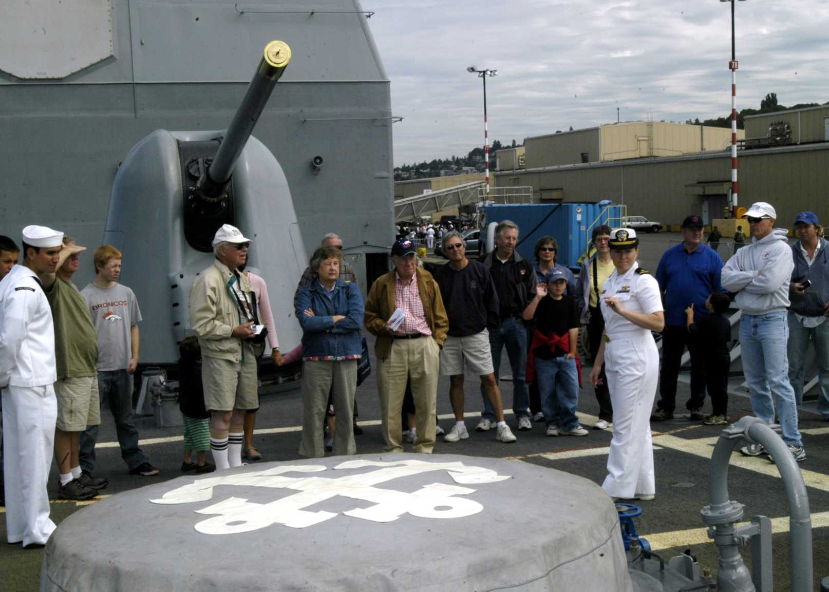 Seattle, WA, 31 July 2008 - Ensign Samantha Foxton, strike officer aboard the guided-missile cruiser USS Princeton (CG 59), describes the ship's anchor assembly to a tour group on the ship's foc'scle. The ship is in Seattle for Sea Fair, a month-long festival sponsored by the city. U.S. Navy photo #080731-N-4649C-003 by Mass Communication Specialist 2nd Class Chantel M. Clayton. |