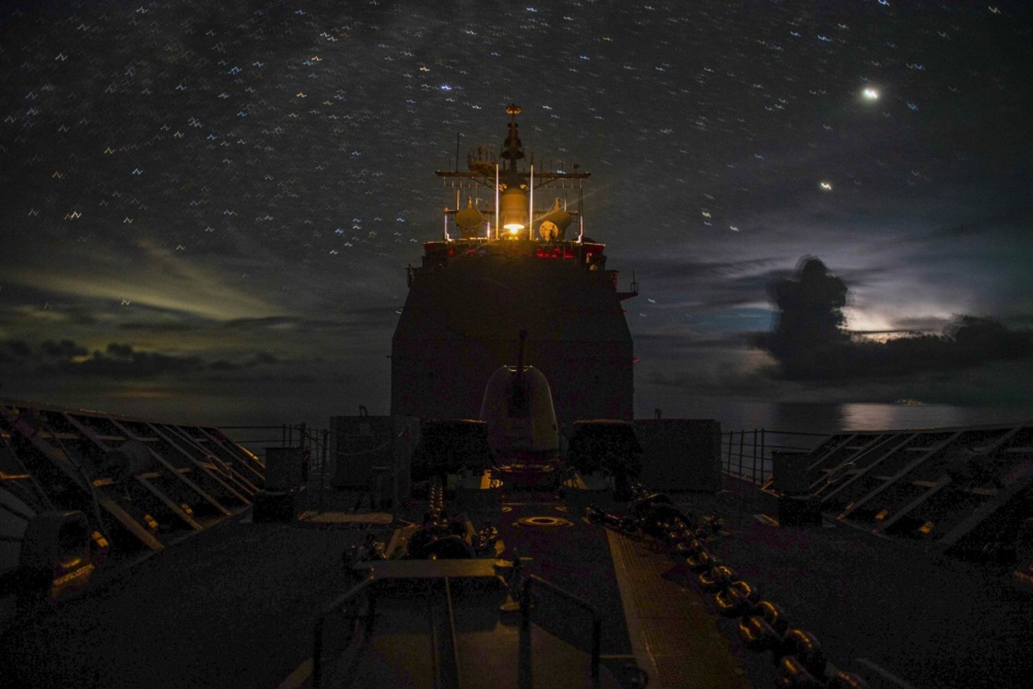 175k | SOUTH CHINA SEA, 15 July 2020 - The Ticonderoga-class guided-missile cruiser USS Princeton (CG 59) steams through the night in the South China Sea. Princeton is part of the Nimitz Carrier Strike Group and is deployed conducting maritime security operations and theater security cooperation efforts. U.S. Navy photo #200715-N-OW019-0007 by Mass Communication Specialist 2nd Class Logan C. Kellums |