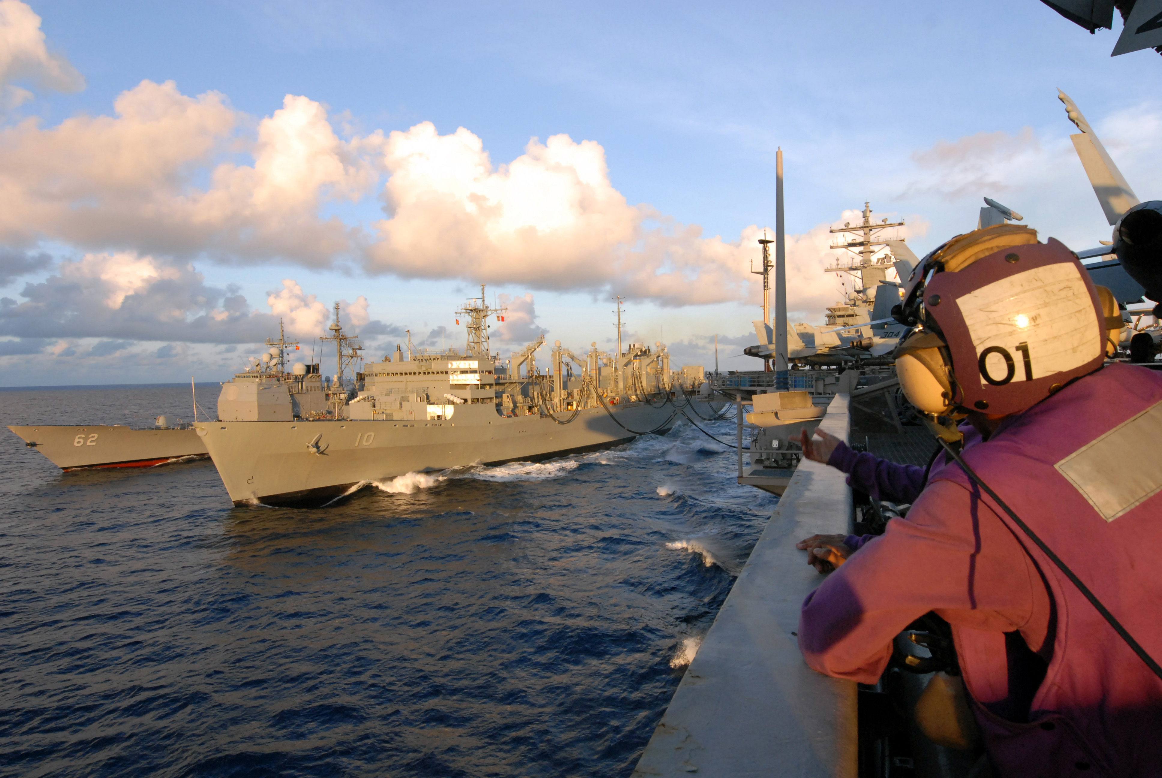 PACIFIC OCEAN, 29 March 2008 - Sailors aboard the guided-missile cruiser USS Chancellorsville (CG 62) hold a line while Chancellorsville takes on fuel during a refueling-at-sea (RAS) with the Nimitz-class aircraft carrier USS Ronald Reagan (CVN 76). U.S. Navy photo #080329-N-4005H-326 by Mass Communication Specialist Seaman Aaron Holt. |