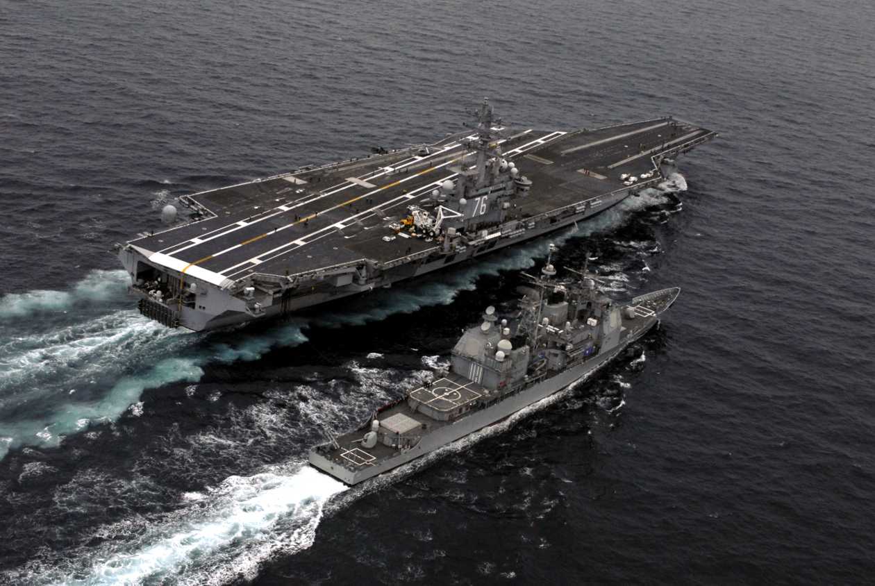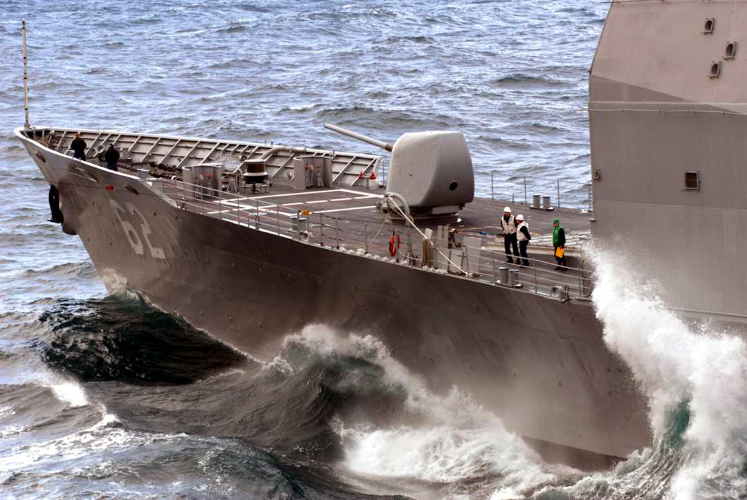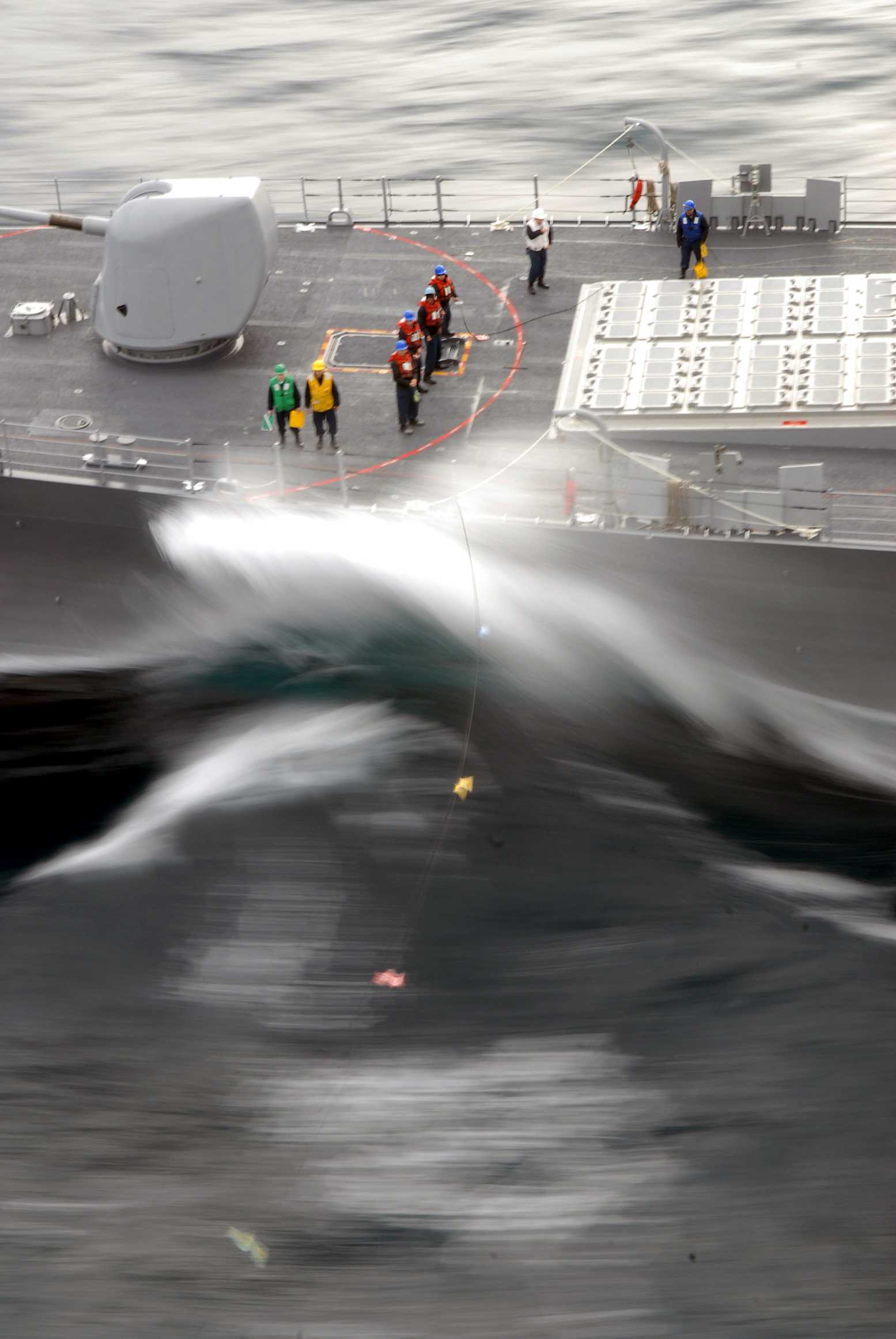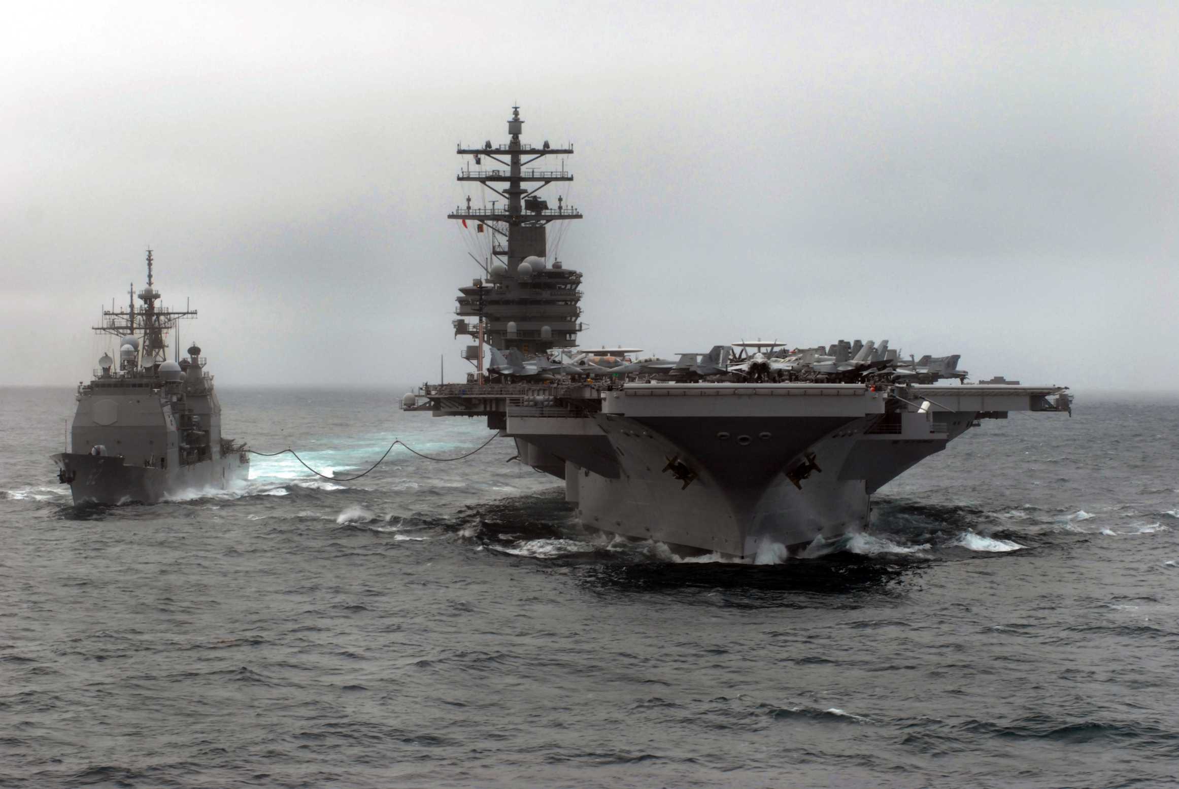 PACIFIC OCEAN, 29 March 2008 - The wake from the nuclear-powered aircraft carrier USS Ronald Reagan (CVN 76) slams against the side of the guided-missile cruiser USS Chancellorsville (CG 62) during a refueling-at-sea (RAS). U.S. Navy photo #080329-N-4776G-203 by Mass Communication Specialist 3rd Class Kathleen Gorby |