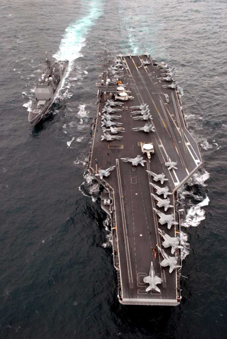 PACIFIC OCEAN, 29 March 2008 - An overhead view of the USS Ronald Reagan (CVN 76) conducting a refueling-at-sea (RAS) with the guided-missile cruiser USS Chancellorsville (CG 62). U.S. Navy photo#080329-N-0555B-058 by Mass Communication Specialist 2nd Class Christopher D. Blachly. |