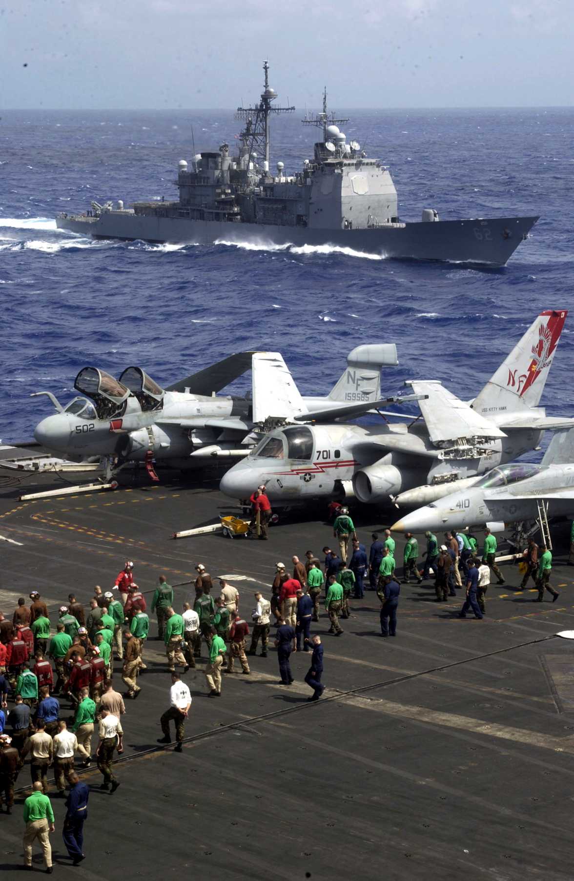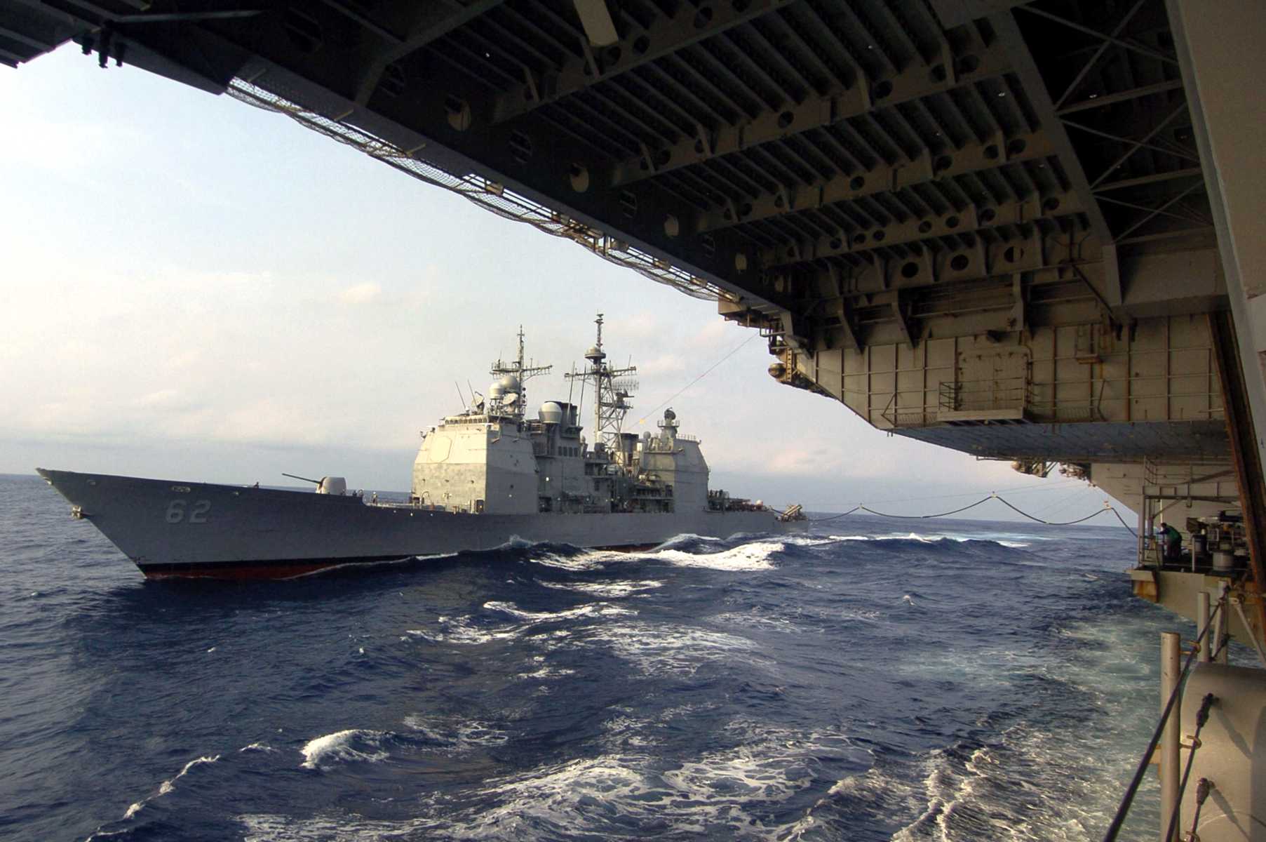 9 February 2001 - The guided missile cruiser USS Chancellorsville (CG 62) follows close behind USS Kitty Hawk (CV 63) during a replenishment at sea (RAS) evolution. Kitty Hawk is underway from her homeport in Yokosuka, Japan and is conducting routine carrier qualifications in the Western Pacific Ocean. U.S. Navy photo #010209-N-3400W-011 by Photographer's Mate 3rd Class Alex C. Witte. |