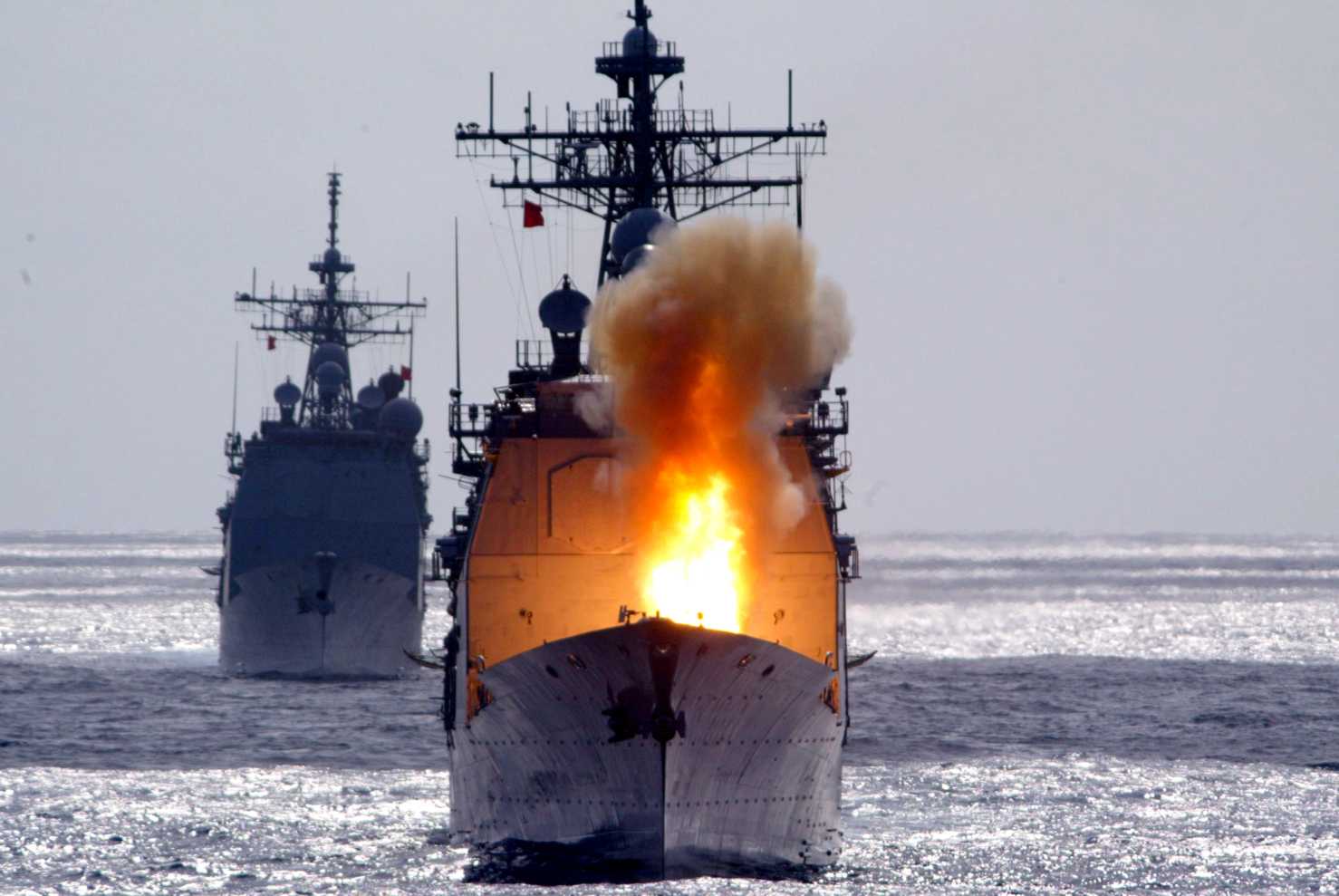 PACIFIC OCEAN, 5 November 2003 - The guided missile cruiser USS Chancellorsville (CG 62) fires a surface-to-air Standard Missile-2 (SM-2) during MISSILEX 04-1, while underway in the western Pacific Ocean with the cruiser USS Cowpens (CG 63) following close behind. MISSILEX 04-1 involves firing missiles at controllable target drones provided by Commander Fleet Activities Okinawas ordnance department. Each missile fired was equipped with telemetry-gathering instrumentation to provide an accurate assessment of missile performance. U.S. Navy photo #031105-N-0000M-001 by Intelligence Specialist 1st Class Roberto Montoto. |