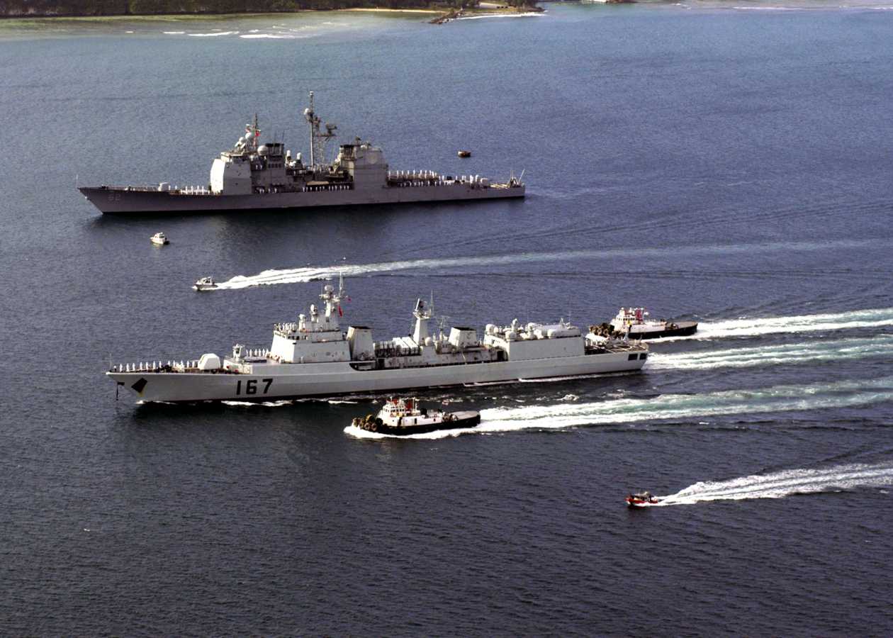 Apra Harbor, Guam, 22 October 2003 - The guided-missile cruiser USS Chancellorsville (CG 62) leads the Peoples Liberation Army Navy (PLAN) guided-missile destroyer Shenzhen (DDG 167) into Apra Harbor, Guam. The Peoples Republic of China destroyer Shenzhen is making the Chinese navys first ever port call to Guam. U.S. Navy photo #31022-N-6346B-045 by Photographers Mate 2nd Class Christopher S. Borgren II. |