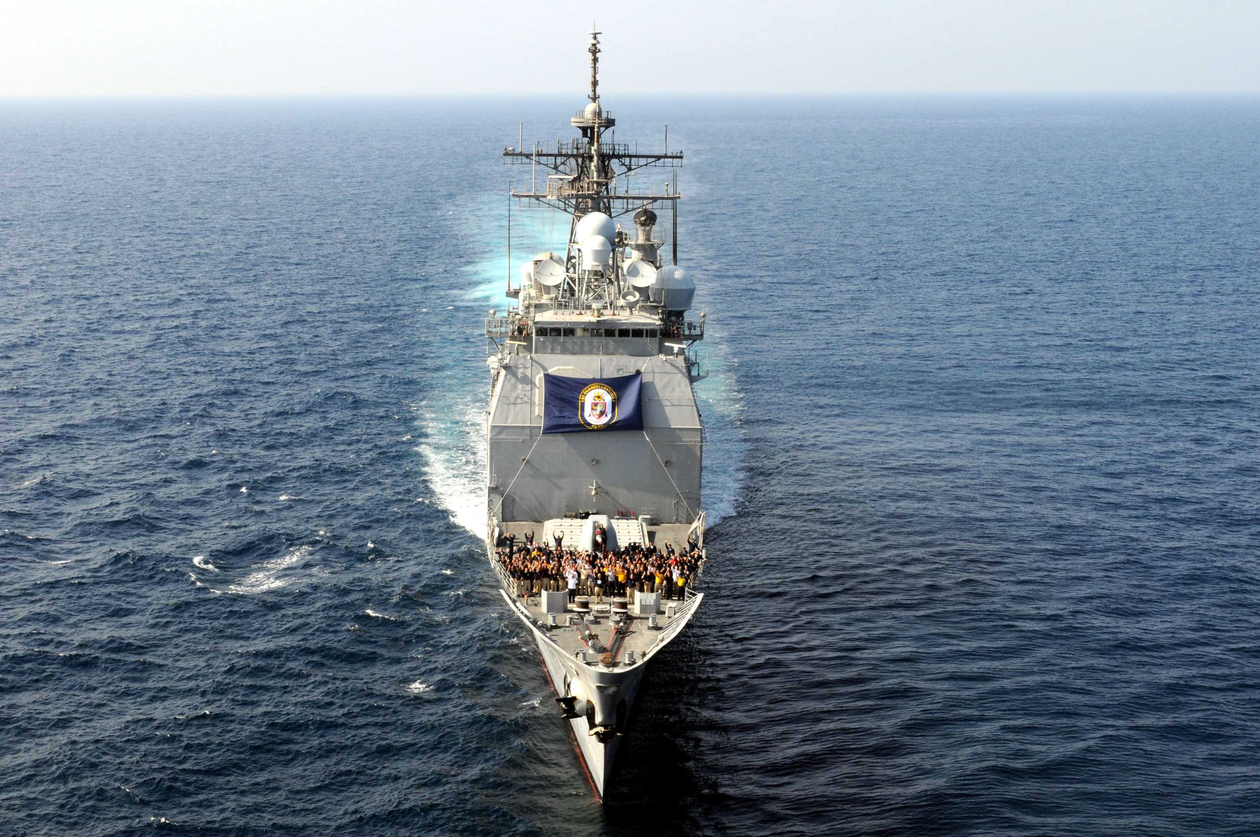 GULF OF OMAN, 13 October 2008 - The crew of the Ticonderoga-class guided-missile cruiser USS Chancellorsville (CG 62) pose for a group photo on the forecastle. Chancellorsville set up the group photo and flew the ship's battle flag in honor of the U.S. Navy's 233rd birthday. The Ronald Reagan Carrier Strike Group is deployed to the U.S. 5th Fleet area of responsibility, focused on reassuring regional partners of the United States' commitment to security, which promotes stability and global prosperity. U.S. Navy photo #081013-N-3659B-211 by Mass Communication Specialist 2nd Class Joseph M. Buliavac. |