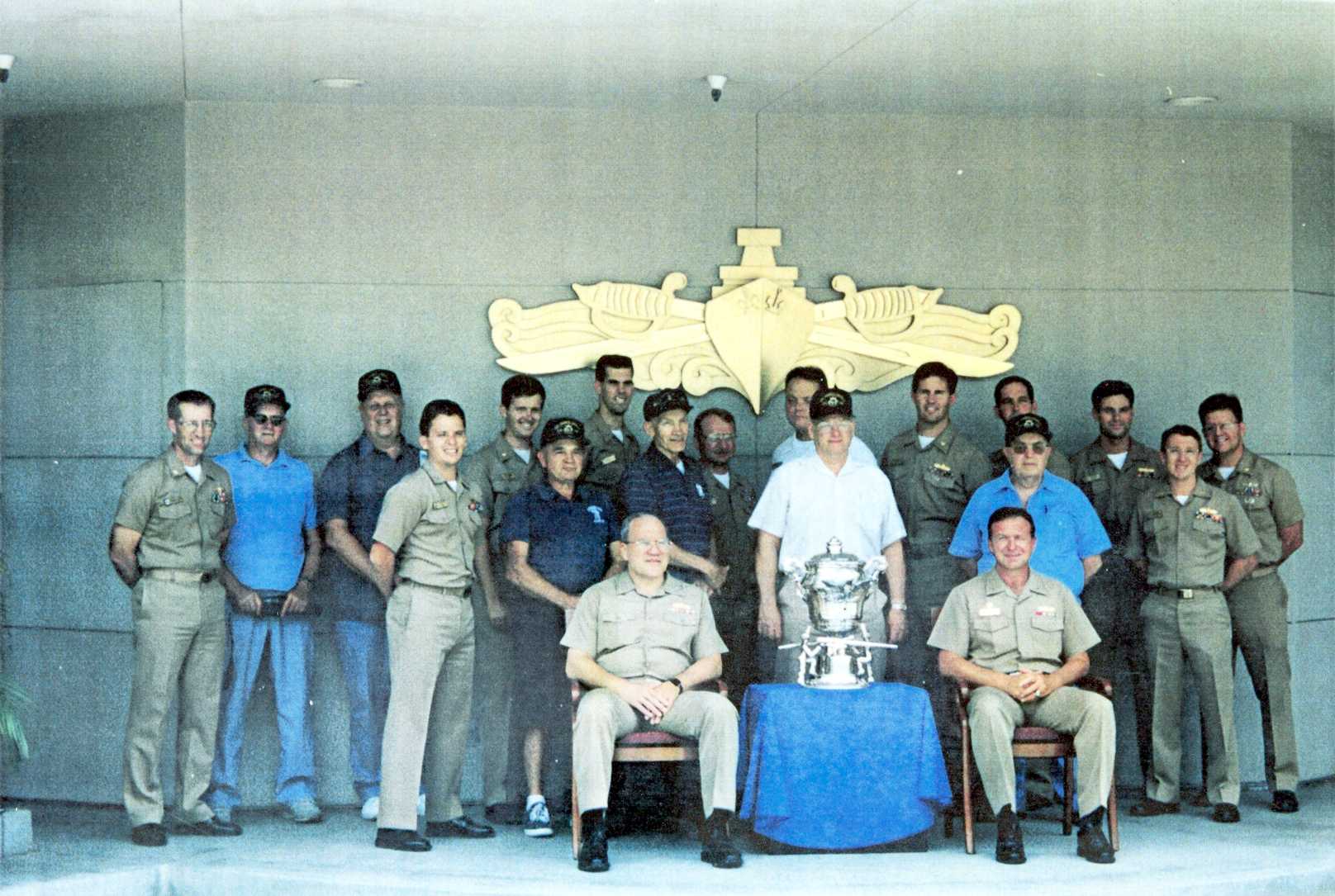in July.) Seated to the right of trophy is CAPT Ed Hebert, behind him is Paul Gourd, to his left John Berry, to his left is me (Bud Colburn), back row, standing, second from left is N.A. "Stretch" Brown. |