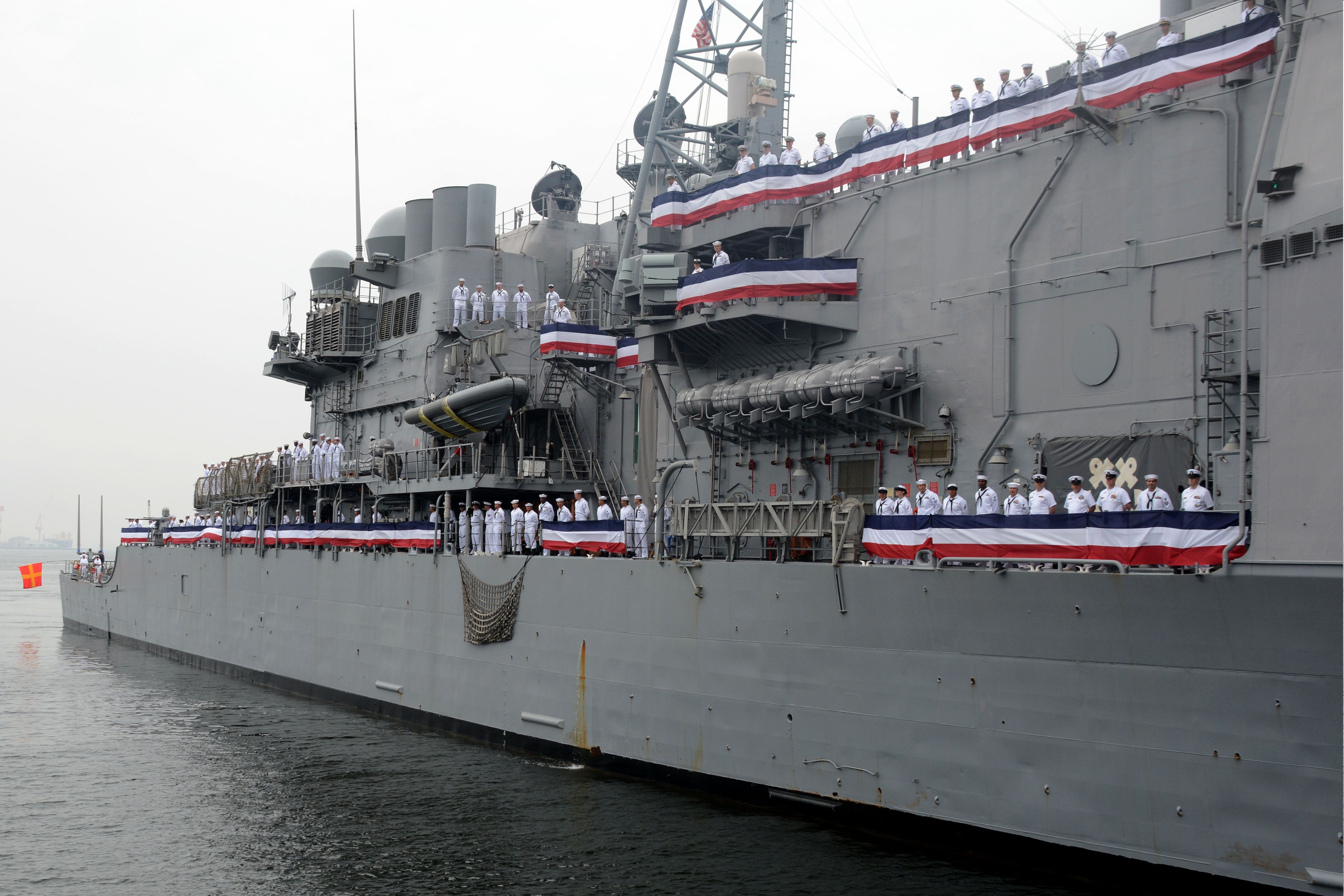 YOKOSUKA, Japan, 18 June 2015 - Sailors man the rails aboard the Ticonderoga-class guided-missile cruiser USS Chancellorsville (CG 62) as it arrives at Commander Fleet Activities Yokosuka to join the forward deployed naval forces deployed to Japan. U.S. Navy photo #150618-N-XN177-087 by Mass Communications Specialist 2nd Class Peter Burghart |