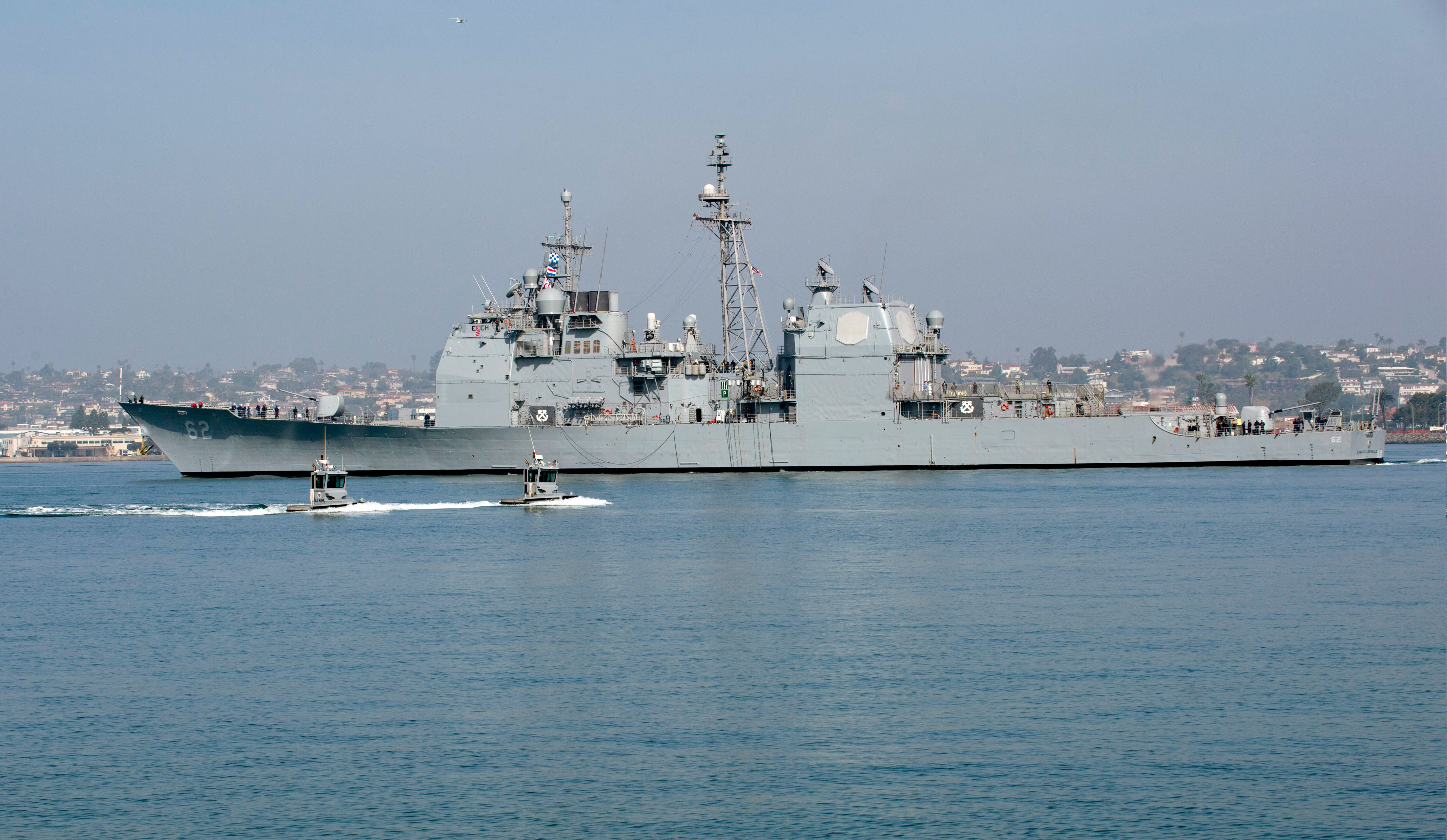 The Ticonderoga-class guided-missile cruiser USS Chancellorsville (CG 62) pulls out of San Diego Harbor for a training exercise in March 2013. US Navy Photo |