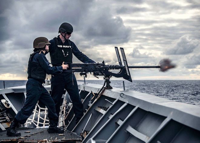 70k | PACIFIC OCEAN, 7 January 2020 - Gunner's Mate 2nd Class Austin Perry instructs Logistics Specialist 3rd Class Annette Hertz as she fires a .50-caliber machine gun during crew-served weapons training aboard the Ticonderoga-class guided-missile cruiser USS Chancellorsville (CG 62). Chancellorsville is forward-deployed to the U.S. 7th Fleet area of operations in support of security and stability in the Indo-Pacific region. U.S. Navy photo by Mass Communication Specialist 1st Class Jeremy Graham |
