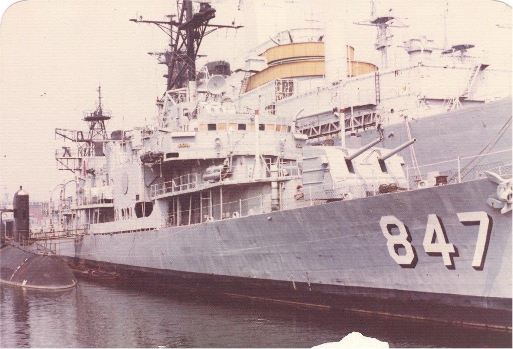 At Philadelphia Navy Yard, July 1976. Left to right,ex-Albacore (AGSS 569), ex-Robert L. Wilson (DD 847) and ex-Northampton (CC 1). |