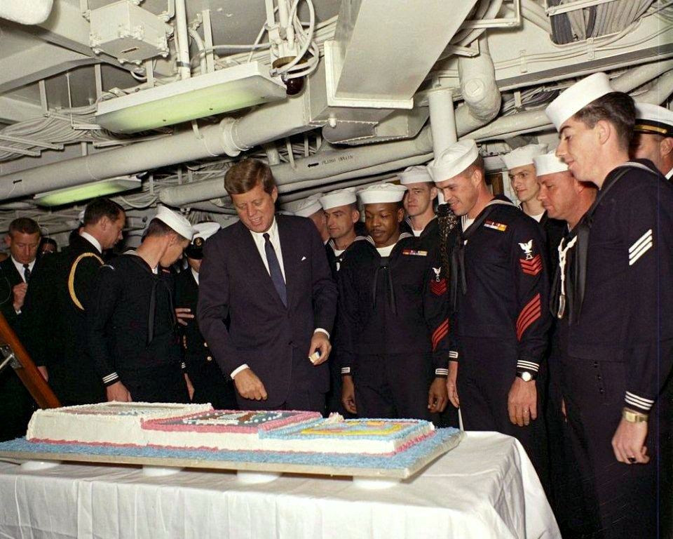 149k | A cake is presented to President John F. Kennedy aboard the USS Northampton, 13 April 1962. | Tommy Trampp |