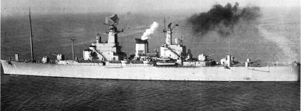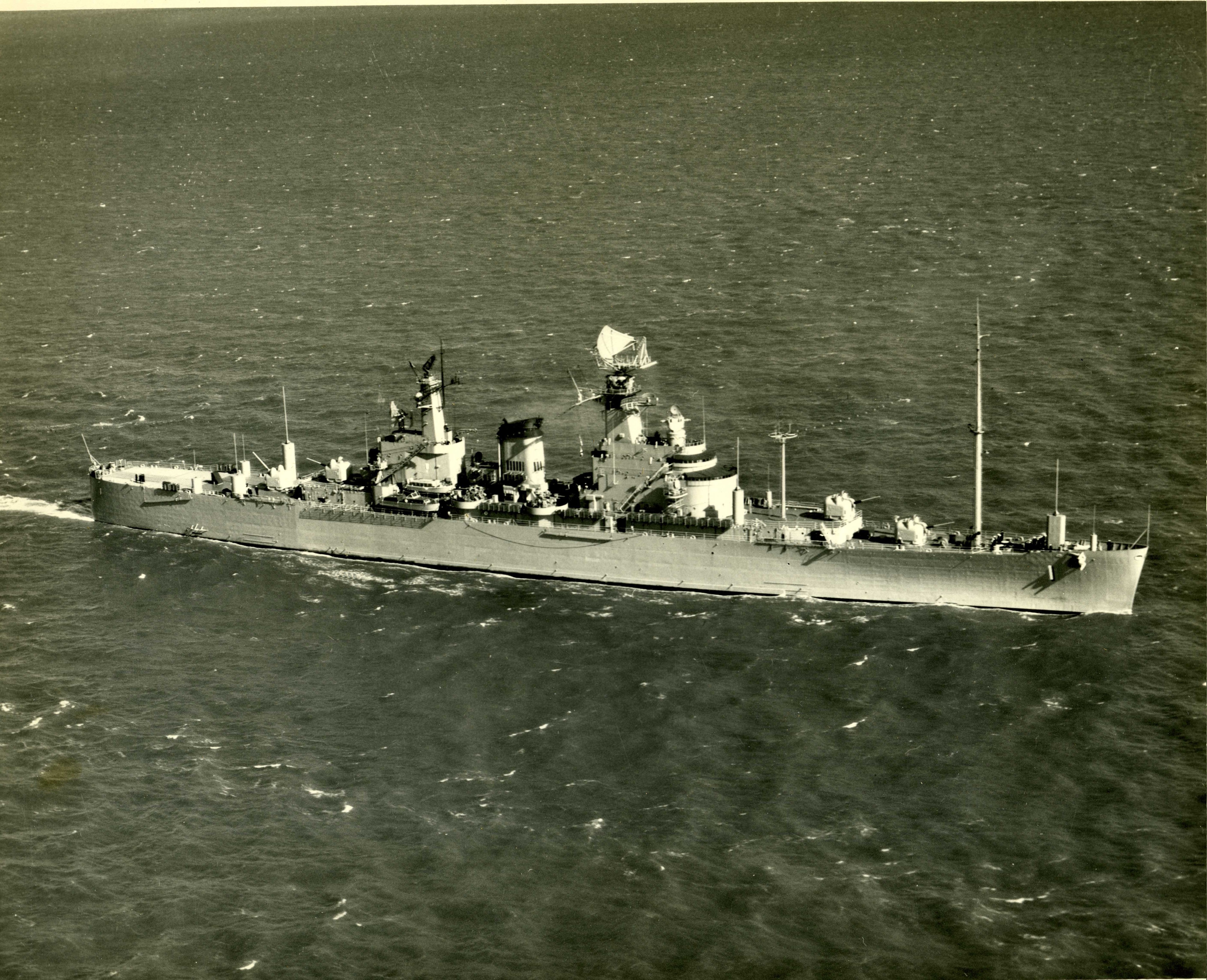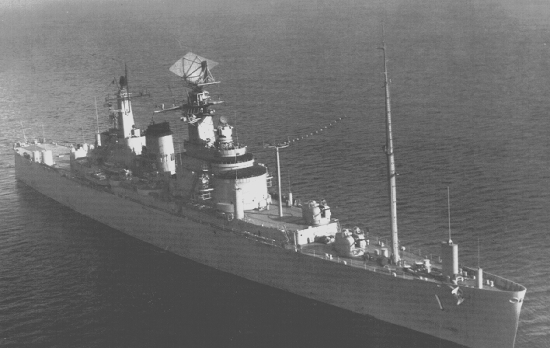 116k | Shown off Boston on 3 March 1954, the full array of radars and antennas are easily seen in these two views. Armed with 5"/54 caliber rapid fire guns and 3"/50 light weight A.A. weapons (until the twin 3"/70 gun was became available), these seem small as they are dwarfed by the massive amount of electronics. All of these height finder, hemispheric-scan, radio and wire radars and antennas are necessary for her command cruiser role. | USN |
