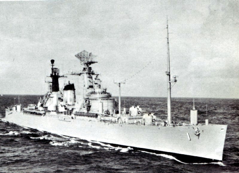 103k | Shown off in Boston on 3 March 1954, the full array of radars and antennas are easily seen in these two views. Armed with 5"/54 caliber rapid fire guns and 3"/50 light weight A.A. weapons (until the twin 3"/70 gun was became available), these seem small as they are dwarfed by the massive amount of electronics. All of these height finder, hemispheric-scan, radio and wire radars and antennas are necessary for her command cruiser role. | USN |