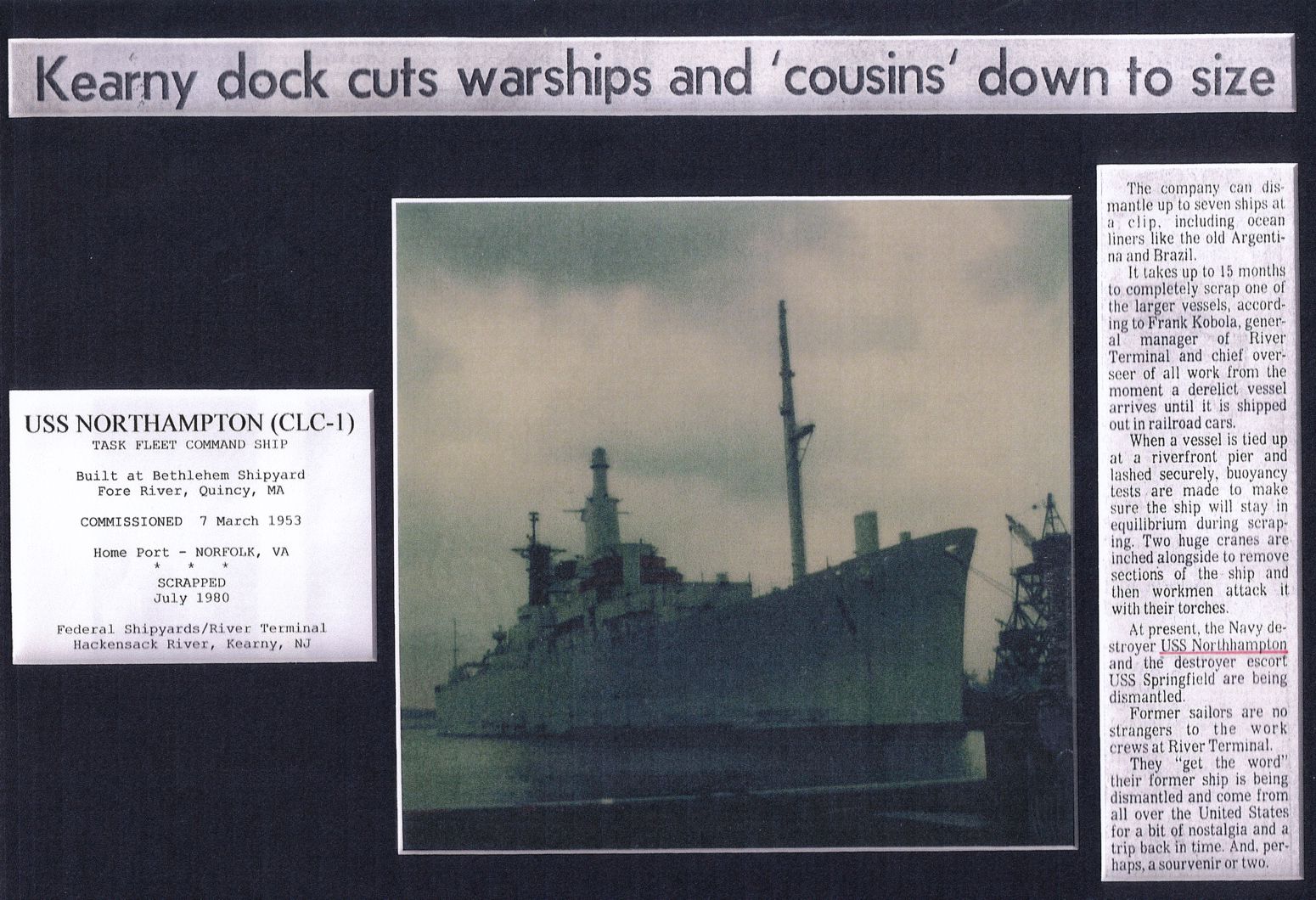 319k | Photo of the ex-Northampton awaiting the cutters torch along with a short news article about her and Federal Shipyards in Kearney, NJ. | Len Glaser, LTJG, USNR (Ret.) |