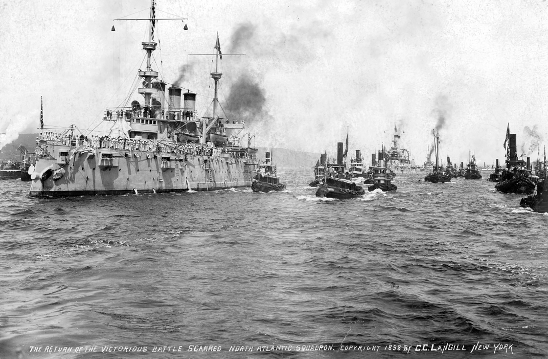 NR | ADMIRAL SAMPSON'S VICTORIOUS FLEET FIRING A SALUTE AT GRANT'S TOMB. New York gave a royal welcome to the victorious squadron of Rear Admiral William T. Sampson. When the armored cruiser New York (ACR-02), the flagship of Rear Admiral Sampson; the armored cruiser Brooklyn (ACR-3), the flagship of Rear Admiral Schley; the formidable battleships Massachusetts (BB-2), Oregon (BB-3), Iowa (BB-4), Indiana (BB-1) and Texas began their parade through New York bay and up the North river, they were surrounded by a monster fleet of excursion boats and tugs profusely decorated with Old Glory. The battle scarred ships were also decked with bunting, and as they steamed slowly along they were greeted by the booming of cannons from the pleasure yachts and the shrill shrieks of the whistles of the excursion fleet. Proceeding up the North river, the New York floating Rear Admiral Sampson's flag, was in the lead. Then came the mammoth cruiser Brooklyn, with Rear Admiral Schley's new flag floating proudly at her fore truck, and, following the Brooklyn in the order named, were the Massachusetts, the Oregon, the Iowa, the Indiana and the Texas. When the fleet of cruisers and battleships reached Grant's tomb, the guns that spoke at Santiago were again heard in a grand national salute of 21 guns. | Image and text provided by University of California, Riverside. Photo from The Record-Union. (Sacramento, Calif.) 1891-1903, 26 August 1898, Image 1, via chroniclingamerica.loc.gov. |