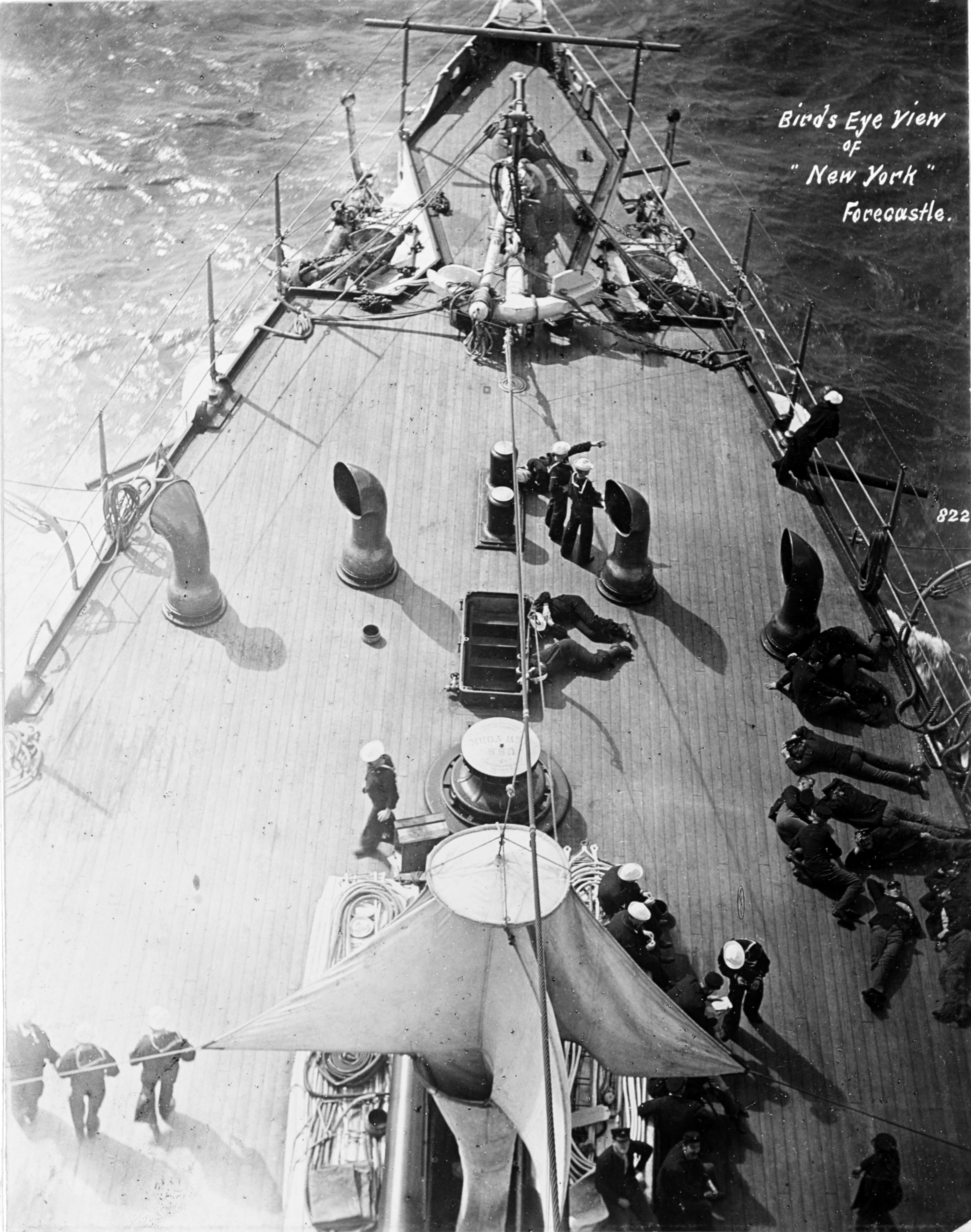 New York (ACR-2) sailors relaxing on the forecastle, in 1898, seen from the masthead. Note: Wind sail anchor stowed decorated capstan cowl vents. Photo & text courtesy of history.navy.mil |